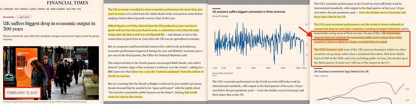«Συν τοις άλλοις, οι στατιστικολόγοι του Ηνωμένου Βασιλείου υιοθέτησαν διαφορετικές μεθόδους για τη μέτρηση της παραγωγής του δημόσιου τομέα από ό,τι άλλες χώρες, γεγονός που είχε ως αποτέλεσμα μεγαλύτερη καταγεγραμμένη πτώση της παραγωγής. Το ONS, ωστόσο, δήλωσε ότι οι περισσότερες από τις κακές επιδόσεις του Ηνωμένου Βασιλείου σε σχέση με άλλες χώρες ήταν πραγματικές και όχι μια στατιστική εκτροπή».