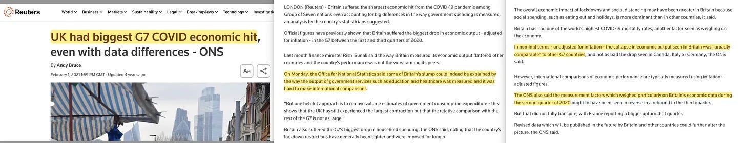 «Σε ονομαστικούς όρους - μη προσαρμοσμένους για τον πληθωρισμό - η κατάρρευση της οικονομικής παραγωγής που παρατηρήθηκε στη Βρετανία ήταν “σε γενικές γραμμές συγκρίσιμη” με άλλες χώρες της G7...».