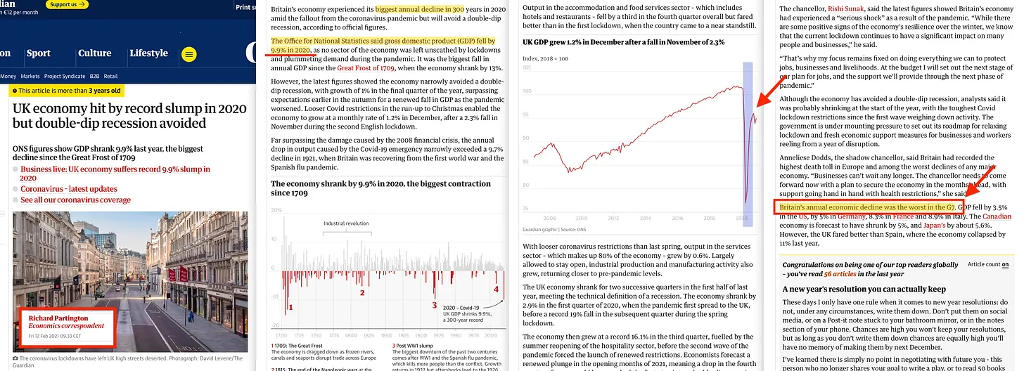 «Η Εθνική Στατιστική Υπηρεσία δήλωσε ότι το ακαθάριστο εγχώριο προϊόν (ΑΕΠ) μειώθηκε κατά 9,9% το 2020... Η ετήσια οικονομική πτώση της Βρετανίας ήταν η χειρότερη στην G7. Το ΑΕΠ μειώθηκε κατά 3,5% στις ΗΠΑ, κατά 5% στη Γερμανία, κατά 8,3% στη Γαλλία και κατά 8,9% στην Ιταλία. Η καναδική οικονομία προβλέπεται να έχει συρρικνωθεί κατά 5% και η οικονομία της Ιαπωνίας κατά περίπου 5,6%».