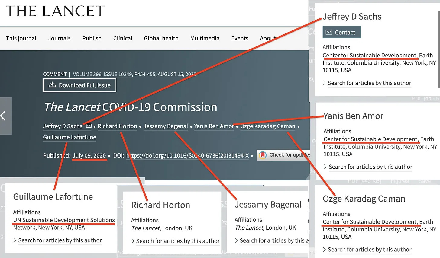 Και μόλις τον επόμενο μήνα, το The Lancet αποφάσισε να συγκροτήσει την «Επιτροπή Covid-19»... στην οποία δεν συμμετείχε ούτε ένας επαγγελματίας υγείας κατά την έναρξή της [9]. Και ο μόνος λόγος για τον οποίο ο Jeff Sachs δεν είδε την ανάγκη να συμπεριληφθούν επαγγελματίες υγείας, ήταν επειδή γνώριζε καλά τα παραπάνω στατιστικά στοιχεία - επειδή αυτό δεν αφορούσε νομίμως καμία απολύτως ασθένεια. Στην πραγματικότητα, το κοινό θέμα μεταξύ αυτών των συμμετεχόντων... είναι η Βιώσιμη Ανάπτυξη.