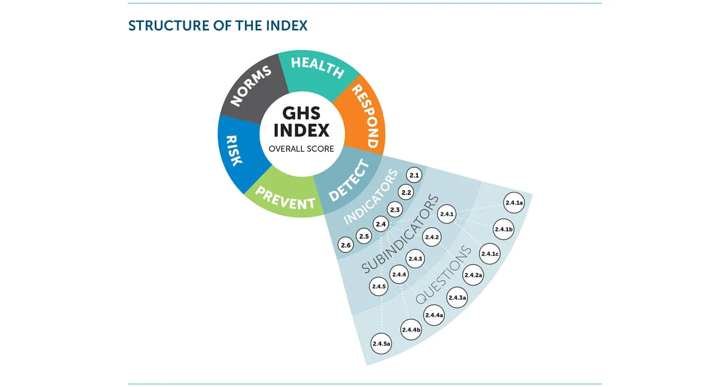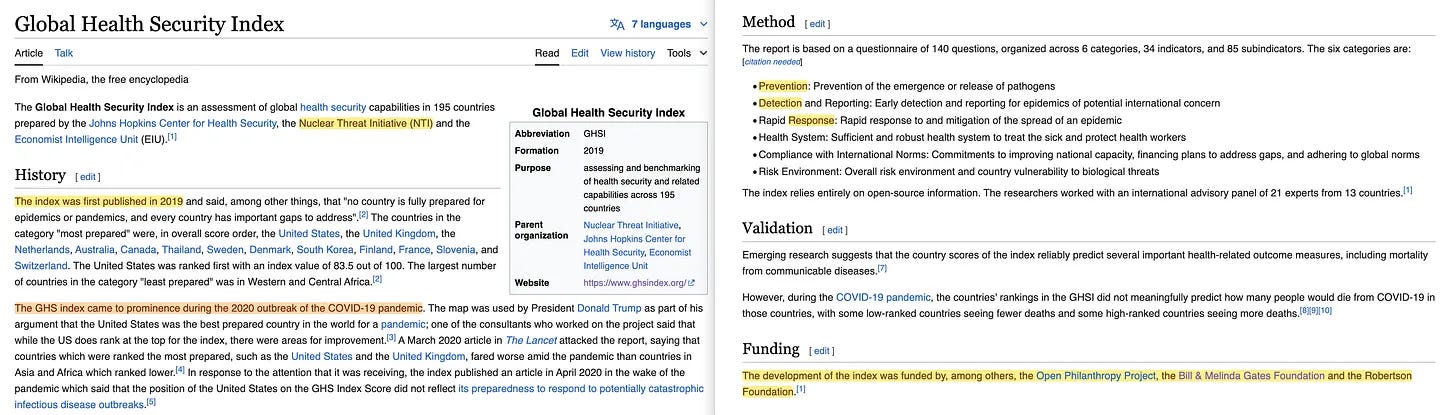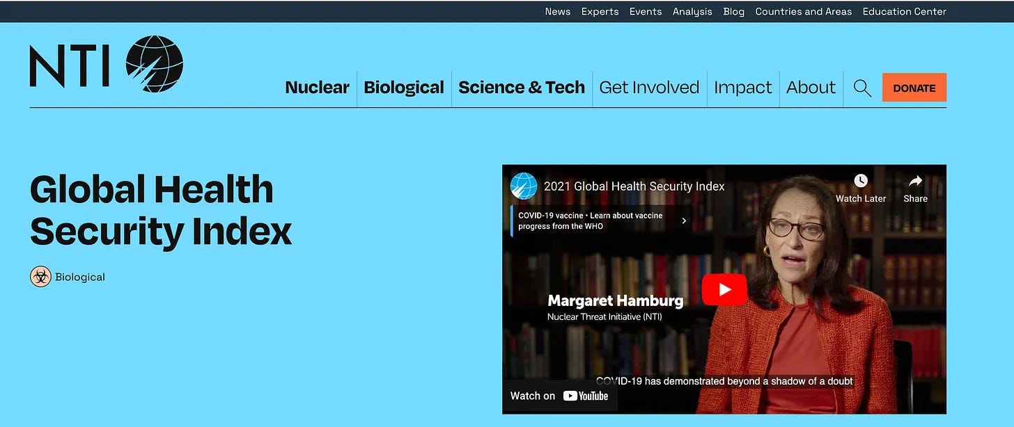 Η Παγκόσμια Ασφάλεια Υγείας έχει επίσης το δικό της δείκτη [2]. Ο οποίος όχι μόνο δημιουργήθηκε το 2019 - άρα πάνω στην ώρα για την απάτη - καθιερώνοντας έτσι ένα επίπεδο έμμεσης πίεσης προς τις κυβερνήσεις να συμμορφωθούν, αλλά και αυτός (εντελώς τυχαία) ιδρύθηκε από την Πρωτοβουλία για την Πυρηνική Απειλή. Α, ναι, και με μπόνους τη χρηματοδότηση της Gates (αν και αυτό είναι πραγματικά αυτονόητο).