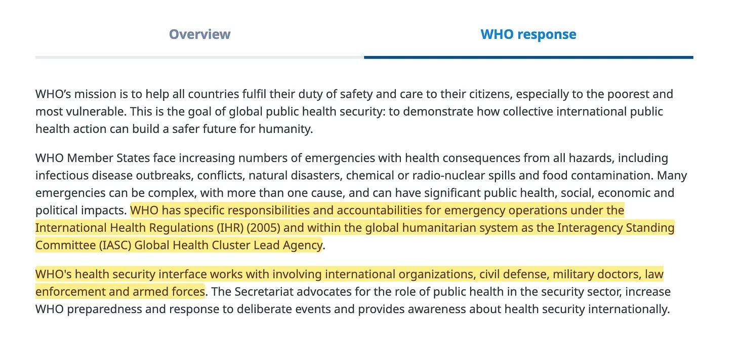 «Ο ΠΟΥ έχει συγκεκριμένες αρμοδιότητες και ευθύνες για τις επιχειρήσεις έκτακτης ανάγκης βάσει των Διεθνών Κανονισμών Υγείας (ΔΚΥ) (2005) και στο πλαίσιο του παγκόσμιου ανθρωπιστικού συστήματος ως ο επικεφαλής οργανισμός του Global Health Cluster της Διυπηρεσιακής Μόνιμης Επιτροπής (IASC)».