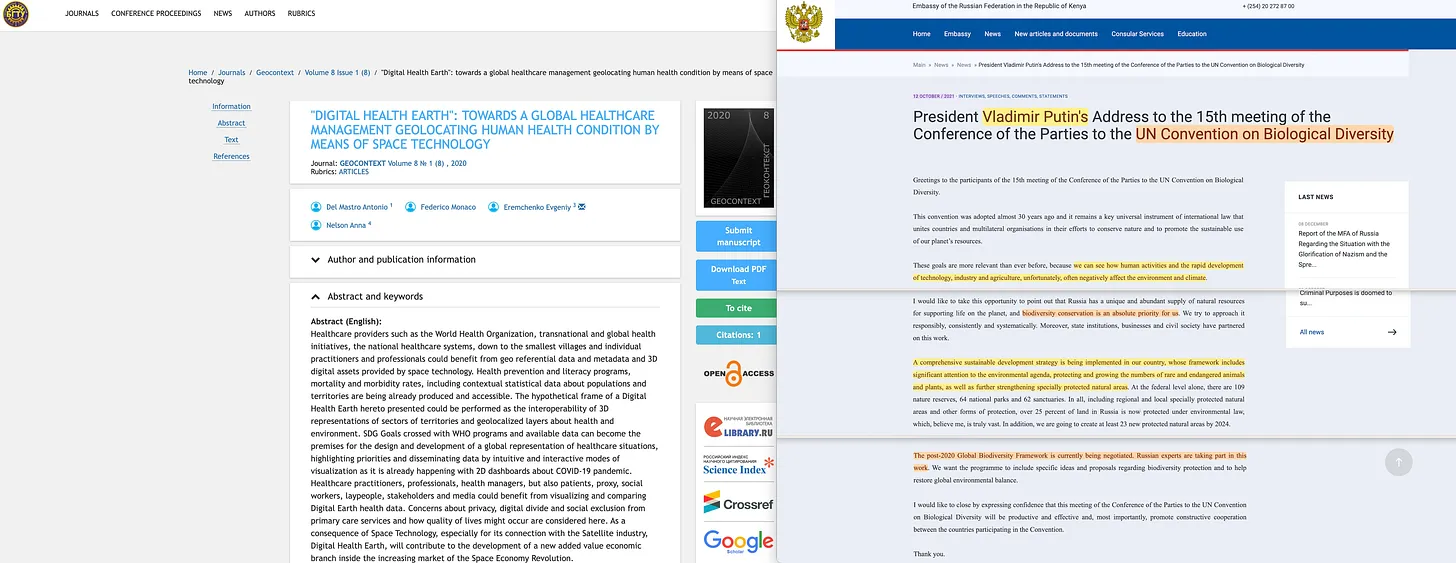 ... Digital Health Earth (με τη χρήση δορυφορικής τροφοδοσίας) [11], η Σύμβαση για τη Βιολογική Ποικιλότητα (στην οποία ο Πούτιν εκφώνησε μάλιστα την εναρκτήρια ομιλία το 2021) [12], ...