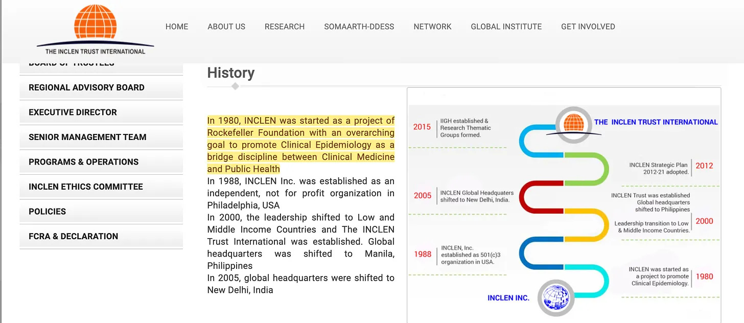 Πρέπει να πω ότι από τότε που ανακάλυψα το INCLEN είχα αμφιβολίες σχετικά με την αφήγηση για το AIDS, επειδή αυτή η πρωτοβουλία του Rockefeller (ποιος άλλος) ξεκίνησε το 1980, τη χρονιά αμέσως πριν από την επίσημη έναρξη του AIDS. Είναι απλώς άλλη μια παράλογα βολική σύμπτωση, ειδικά αν αναλογιστεί κανείς τι κάνει το INCLEN [18]. Το Διεθνές Δίκτυο Κλινικής Επιδημιολογίας διεξάγει διεπιστημονική έρευνα σε θέματα παγκόσμιας υγείας υψηλής προτεραιότητας. Αυτό περιλαμβάνει επιδημιολογικές, οικονομικές και κοινωνιολογικές μελέτες με σκοπό την ενημέρωση για τη χάραξη πολιτικής και τη βελτίωση των συστημάτων υγείας.