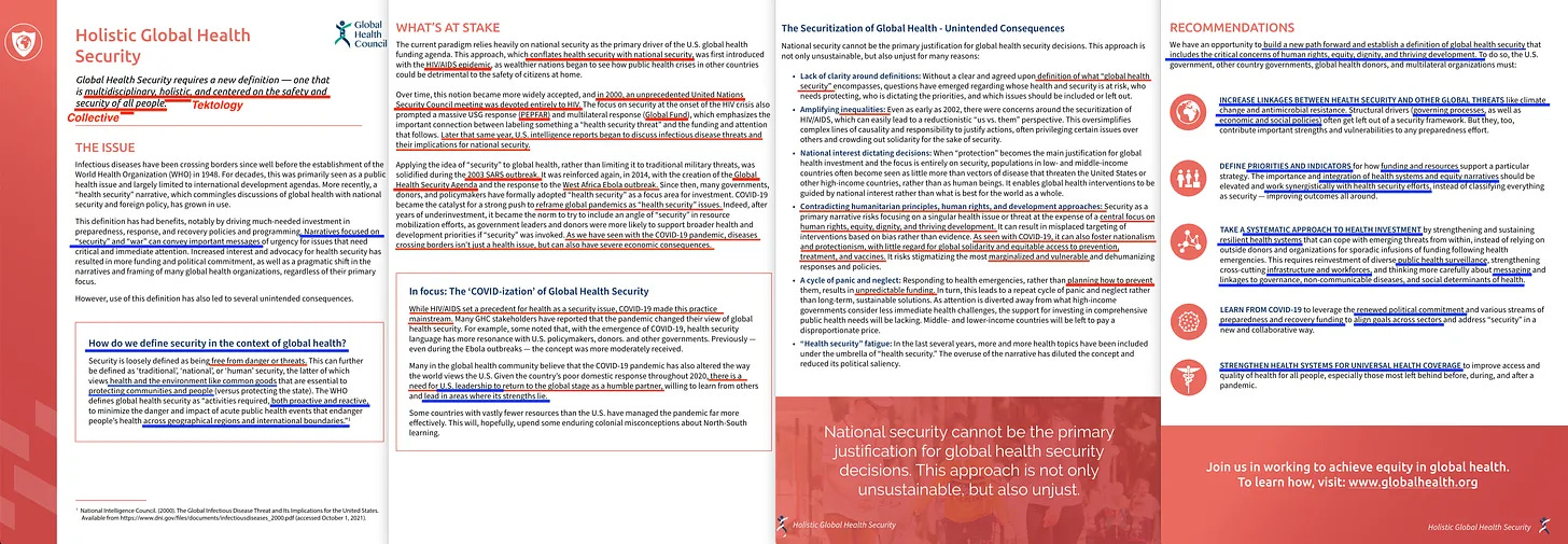 «Το σημερινό παράδειγμα στηρίζεται σε μεγάλο βαθμό στην εθνική ασφάλεια ως πρωταρχική κινητήρια δύναμη της ατζέντας χρηματοδότησης της παγκόσμιας υγείας των ΗΠΑ. Αυτή η προσέγγιση, η οποία συγχέει την ασφάλεια της υγείας με την εθνική ασφάλεια, εισήχθη για πρώτη φορά με την επιδημία του HIV/AIDS, καθώς τα πλουσιότερα έθνη άρχισαν να βλέπουν πώς οι κρίσεις δημόσιας υγείας σε άλλες χώρες θα μπορούσαν να είναι επιζήμιες για την ασφάλεια των πολιτών στο εσωτερικό».