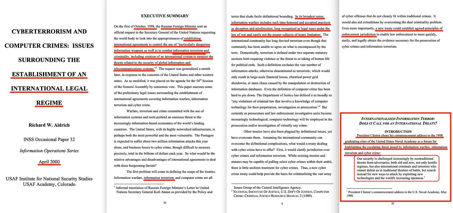 ... αλλά και την έννοια της «πληροφοριακής τρομοκρατίας» το 1998, η οποία αργά αλλά σταθερά μετατράπηκε σε εκκλήσεις για λογοκρισία της «παραπληροφόρησης» και της «λανθασμένης πληροφόρησης» [13].