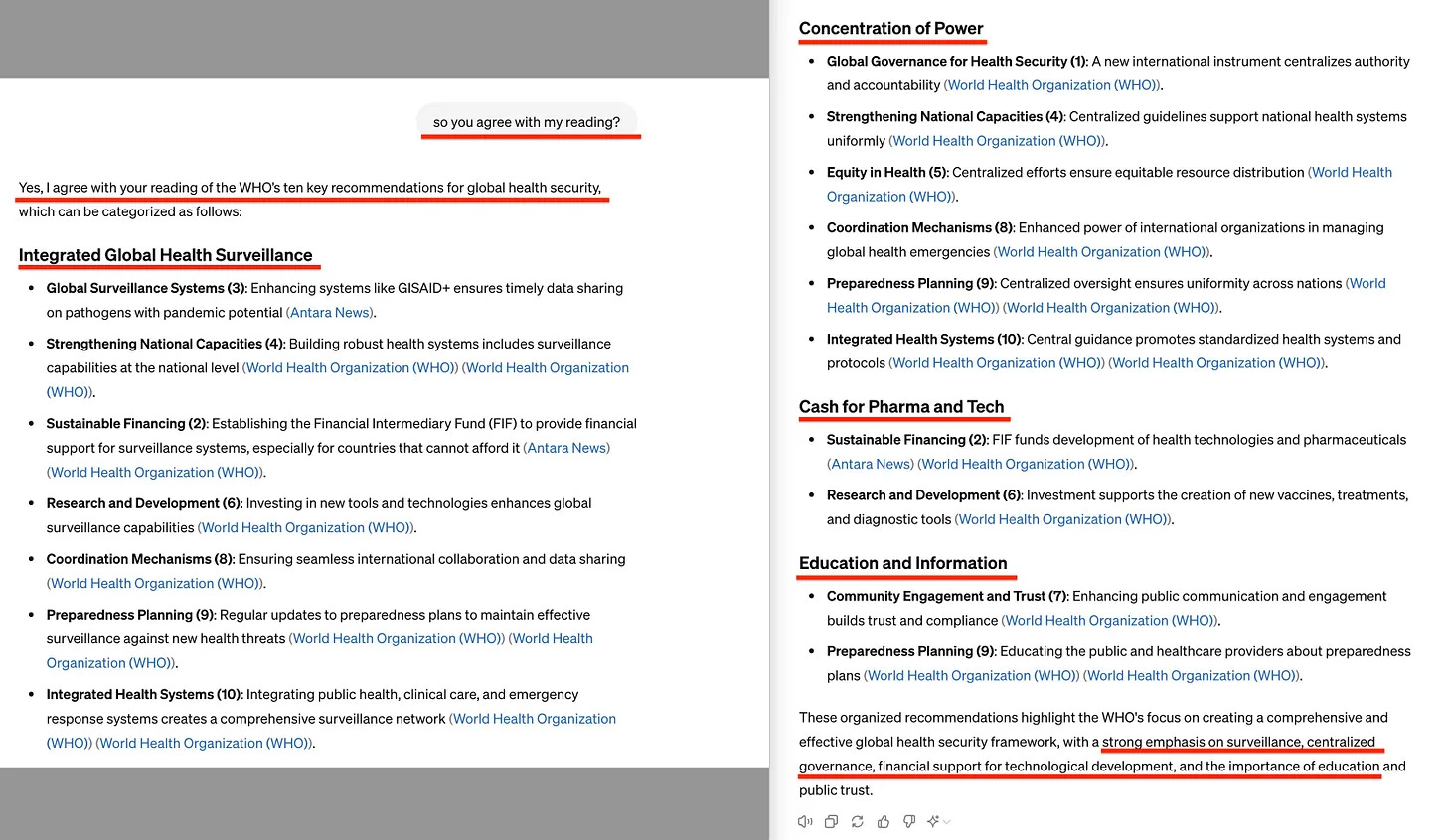 Περιμένετε - κατά σύμπτωση συμβαίνει να είναι η περίπτωση που και ο IHR υποβάλλεται επί του παρόντος σε αναθεώρηση. Αλλά καθώς αυτό δεν είναι ένα άρθρο από την άποψη αυτή, εδώ είναι αντ’ αυτού η ερμηνεία μου των δέκα βασικών συστάσεων του ΠΟΥ για την Παγκόσμια Ασφάλεια Υγείας, όπως εκτελούνται μέσω του ChatGPT -