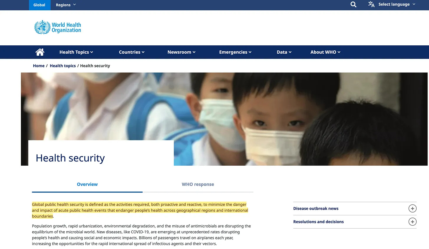 «Ο ΠΟΥ ορίζει την παγκόσμια ασφάλεια υγείας ως »δραστηριότητες που απαιτούνται, τόσο προληπτικά όσο και αντιδραστικά, για την ελαχιστοποίηση του κινδύνου και του αντίκτυπου οξέων συμβάντων δημόσιας υγείας που θέτουν σε κίνδυνο την υγεία των ανθρώπων σε γεωγραφικές περιοχές και διεθνή σύνορα».