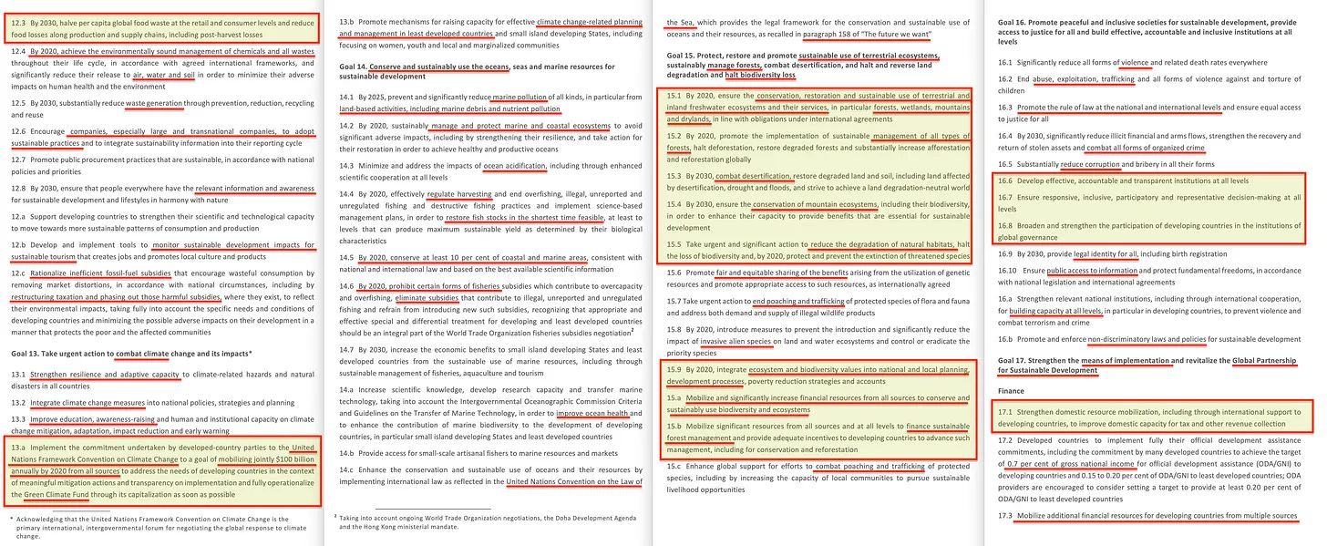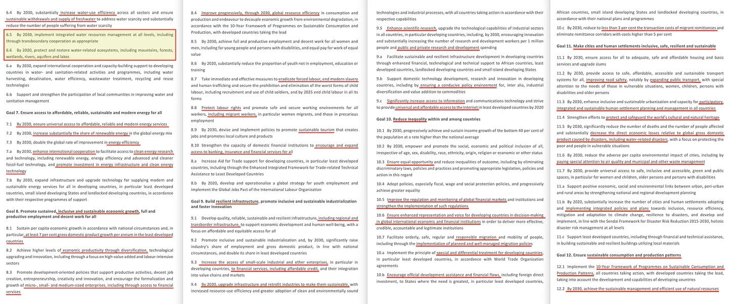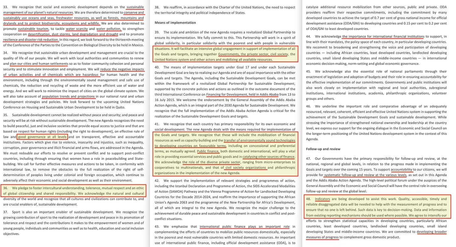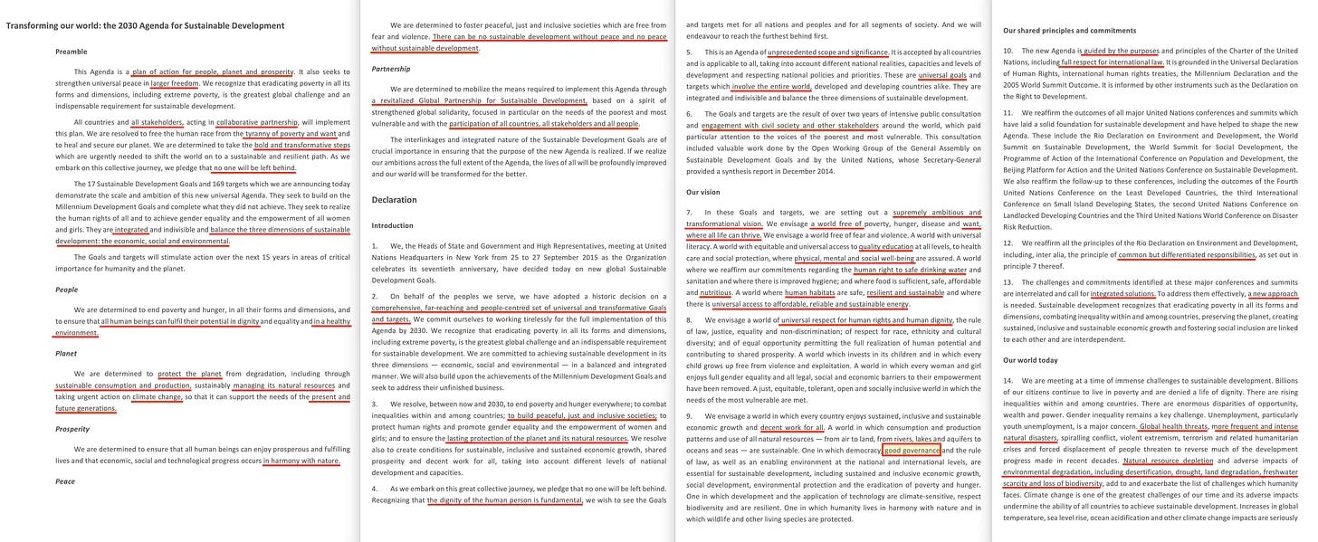 Συνεχίζει: «Όλες οι χώρες και όλα τα ενδιαφερόμενα μέρη, ενεργώντας σε συνεργατική σύμπραξη», αποκαλύπτοντας το επαναλαμβανόμενο θέμα του συλλογισμού των ενδιαφερόμενων μερών από πάνω προς τα κάτω, το οποίο ενισχύεται με το «Είμαστε αποφασισμένοι να κάνουμε τα τολμηρά και μετασχηματιστικά βήματα», το οποίο θα μπορούσε εύκολα να ερμηνευθεί ως “επαναστατικό”, ακολουθούμενο από την κοινή γραμμή «κανείς δεν θα μείνει πίσω». Και πραγματικά αγαπούν αυτή τη φράση, αλλά το κλειδί για να καταλάβετε εδώ είναι ότι αυτό δεν σημαίνει ότι νοιάζονται για εσάς, όχι, μάλλον το αντίθετο, υπονοώντας ότι κανείς δεν επιτρέπεται να εξαιρεθεί.