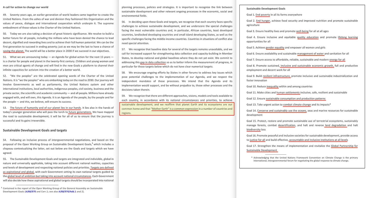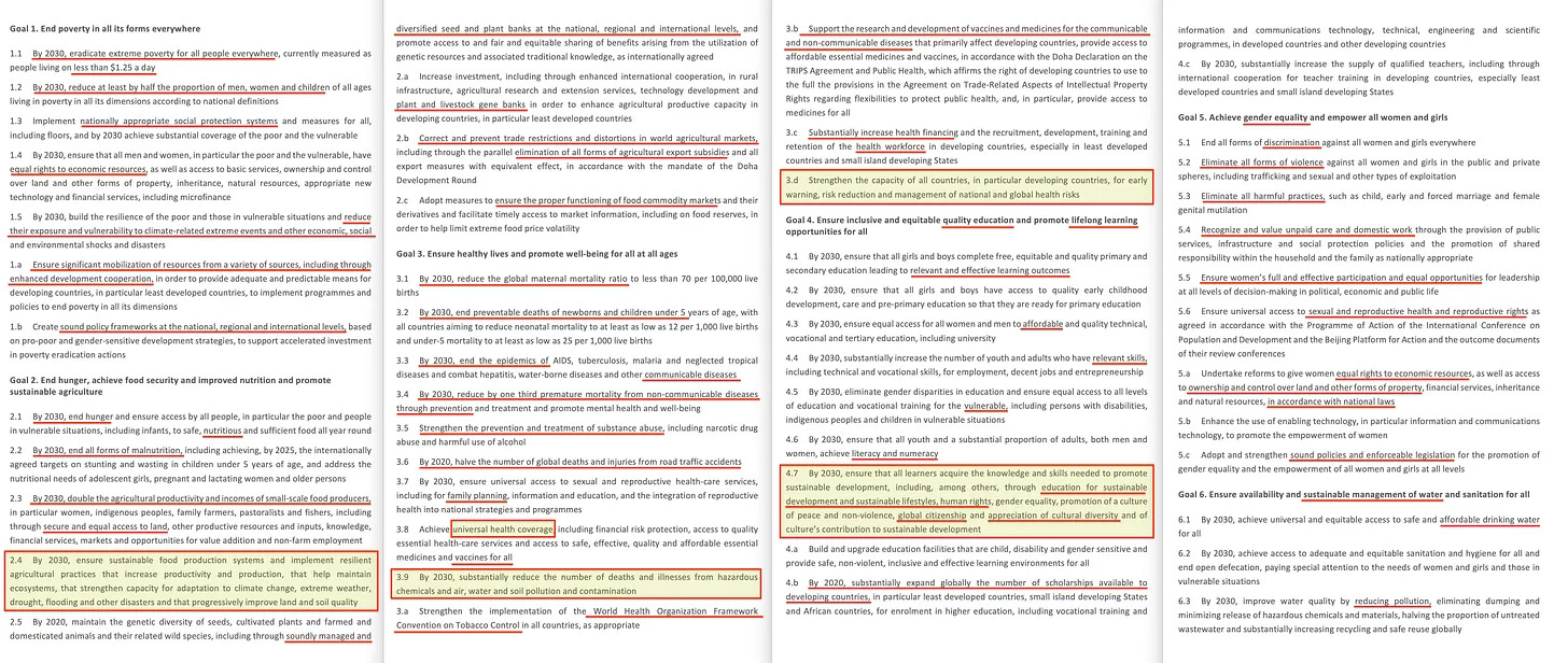 Είναι ένας εντυπωσιακός κατάλογος της Αιδωπικής γλώσσας, όπου «ένας κόσμος απαλλαγμένος από... θέλω» κάπως χαριτολογώντας θα μπορούσε να υποδηλώνει ότι είμαστε όλοι νεκροί, «όλη η ζωή μπορεί να ευδοκιμήσει» υποστηρίζεται είπε, «ποιοτική εκπαίδευση» σημαίνει προκατειλημμένη κομπογιαννίτικη επιστήμη που εισάγεται στο εκπαιδευτικό υλικό και προωθείται μέσω της UNESCO (περισσότερα γι’ αυτό αργότερα), «υγειονομική περίθαλψη» σημαίνει καθολική υγειονομική κάλυψη (έλεγχος από πάνω προς τα κάτω της πληροφόρησης, της εκπαίδευσης, των φαρμάκων και των εμβολίων), και με την «σωματική, ψυχική και κοινωνική ευημερία» να καλύπτει ενδιαφέροντα τρία επίπεδα – εμπειρικό, πραγματιστικό και κανονιστικό – του Δια- και Διεπιστημονικού Πανεπιστημίου του Erich Jantsch [14].
