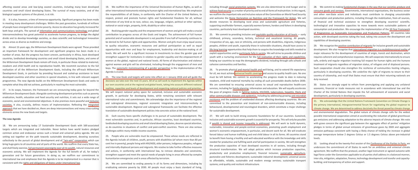 Η «πλήρης πραγμάτωση των δικαιωμάτων και των ικανοτήτων» περιστρέφεται γύρω από μια κολεκτιβιστική αντίληψη για το πού ταιριάζεις στην κοινωνία (σύμφωνα με τον Marc Gafni- αποδεχόμενος ότι είσαι ένα κύτταρο στον ανθρώπινο υπερ-οργανισμό), η καθολική υγειονομική κάλυψη σχετίζεται με μια “αποκεντρωμένη”, από πάνω προς τα κάτω, με προσέγγιση των ενδιαφερομένων μερών παγκόσμια δομή διακυβέρνησης σχετικά με την υγεία, και η υποτιθέμενη «καταπολέμηση της ελονοσίας, ...» είναι ένας βολικός τρόπος πρόσβασης σε χρήματα των φορολογουμένων με πλήρη ατιμωρησία, και προηγουμένως προσπελάστηκε όχι μόνο για την οικοδόμηση παγκόσμιας ικανότητας επιτήρησης της υγείας υπό το πρόσχημα του PEPFAR, αλλά και ως ένας τρόπος για τις μεγάλες φαρμακευτικές εταιρείες να εισπράττουν επανειλημμένα χρήματα των φορολογουμένων με προγράμματα που κάνουν... στην καλύτερη περίπτωση ελάχιστα έως τίποτα.