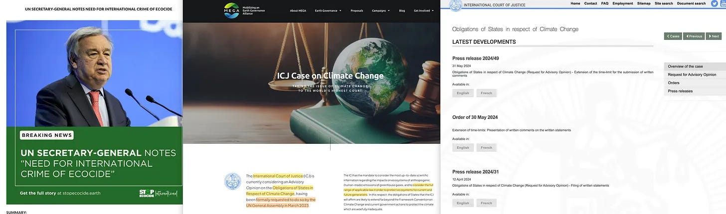 Το θέμα είναι ότι ο εν λόγω νόμος περιλαμβάνει διατυπώσεις σχετικά με τη διασυνοριακή ρύπανση, και κατά συνέπεια, εάν προσπαθήσετε να αναπτύξετε πραγματικά τους εν λόγω φυσικούς πόρους, τότε θα οδηγηθείτε σε διεθνές δικαστήριο για ρύπανση του παγκόσμιου περιβάλλοντος, ένα έγκλημα που σύντομα θα γίνει γνωστό ως «Οικοκτονία» (‘EcoCide’). Και αυτό δεν είναι αστείο, το Διεθνές Δικαστήριο των Ηνωμένων Εθνών εξετάζει αυτή τη στιγμή ακριβώς αυτή την υπόθεση [18], και ακόμη και ο επικεφαλής της ομάδας - ο άνδρας της δράσης του Collegium International, Γενικός Γραμματέας του ΟΗΕ, Antonío Guterres - έχει γνωμοδοτήσει σχετικά με αυτό ακριβώς [19], χωρίς να ξεχνάμε τον Jeffrey D Sachs που σερβίρει ολόκληρη τη στρατηγική σε ασημένια πιατέλα για όσους διαβάζουν αυτό το βιβλίο.