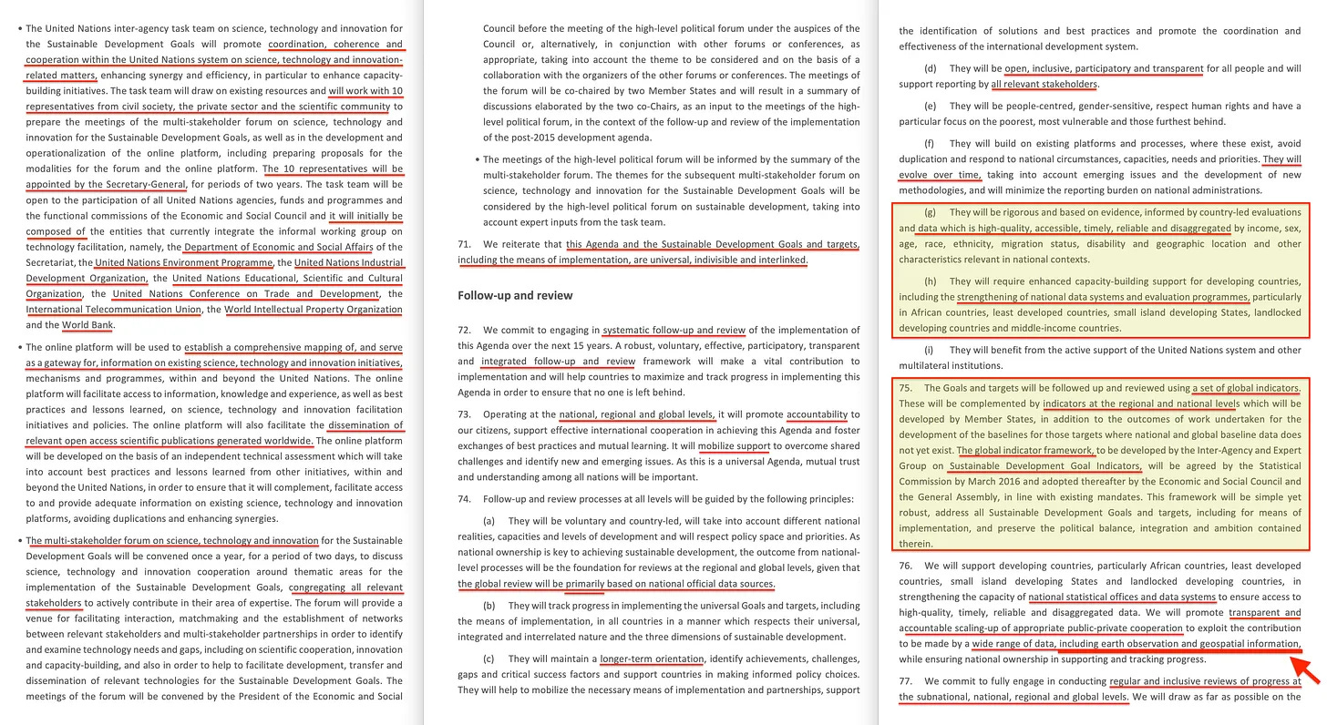 «Θα στηρίξουμε τις αναπτυσσόμενες χώρες, ιδίως τις αφρικανικές χώρες, τις λιγότερο ανεπτυγμένες χώρες, τα μικρά νησιωτικά αναπτυσσόμενα κράτη και τις αναπτυσσόμενες χώρες που δεν έχουν πρόσβαση σε ξηρά, στην ενίσχυση της ικανότητας των εθνικών στατιστικών υπηρεσιών και των συστημάτων δεδομένων, ώστε να εξασφαλίζεται η πρόσβαση σε υψηλής ποιότητας, έγκαιρα, αξιόπιστα και αναλυτικά δεδομένα. Θα προωθήσουμε τη διαφανή και υπεύθυνη κλιμάκωση της κατάλληλης συνεργασίας δημόσιου και ιδιωτικού τομέα για την αξιοποίηση της συμβολής που μπορεί να επιτευχθεί από ένα ευρύ φάσμα δεδομένων, συμπεριλαμβανομένων της παρατήρησης της γης και των γεωχωρικών πληροφοριών, διασφαλίζοντας παράλληλα την εθνική ευθύνη για την υποστήριξη και την παρακολούθηση της προόδου».