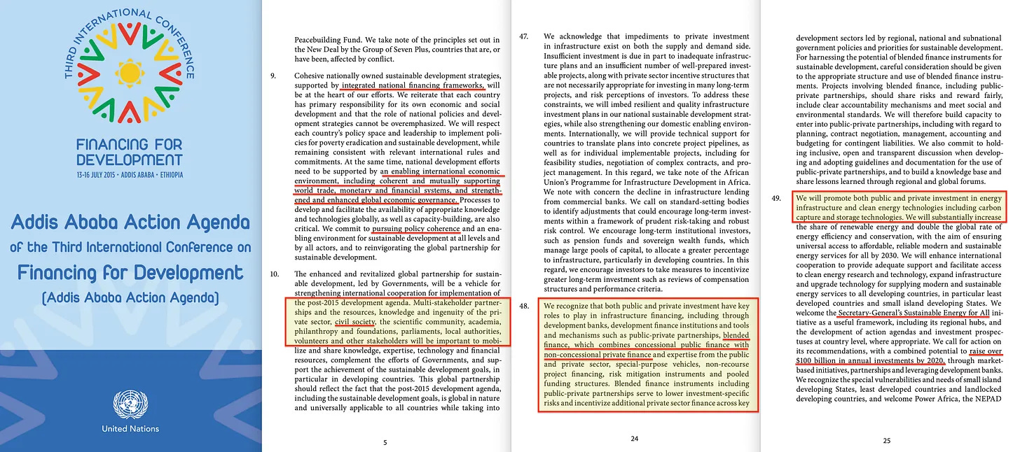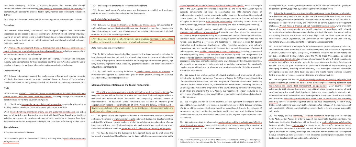 Το σημείο 62 επαναλαμβάνει την Addis Abeba, όπου οριστικοποιήθηκε η μικτή χρηματοδότηση, αλλά με περαιτέρω σχόλια για το χρέος και τη βιωσιμότητα του χρέους, το σημείο 63 προτείνει τη χρηματοοικονομική ολοκλήρωση, πρώτα μέσω εθνικών πλαισίων, στη συνέχεια ένα «ευνοϊκό διεθνές οικονομικό περιβάλλον» και τέλος μια πλήρη έκκληση για «ενισχυμένη παγκόσμια οικονομική διακυβέρνηση». Το σημείο 64 προσθέτει τις διάφορες στρατηγικές και πρωτοβουλίες προγραμμάτων που συμφωνήθηκαν, πριν το σημείο 65 προσθέσει την ανάγκη για τις χώρες μεσαίου εισοδήματος να εντείνουν το παιχνίδι τους, το σημείο 66 προσθέτει μια έκκληση προς όλα τα έθνη να... συμμετάσχουν σε προσοδοφόρες συμπράξεις δημόσιου και ιδιωτικού τομέα (για τις επιχειρήσεις, δηλαδή), για να υμνήσει τον επιχειρηματικό τομέα στο σημείο 67, πριν το σημείο 68 ζητήσει «ουσιαστική απελευθέρωση του εμπορίου», που θα ωφελήσει τους συνδεδεμένους εσωτερικούς - όπως πάντα συμβαίνει Και το σημείο 69 υπογραμμίζει εκ νέου την ανάγκη να βοηθηθούν οι αναπτυσσόμενες χώρες . μέσω της ελάφρυνσης του χρέους και της αναδιάρθρωσης (διευκολύνοντας τελικά τη μεταφορά εγγυήσεων), πριν από το σημείο 70, τέλος, ζητά έναν «Μηχανισμό Διευκόλυνσης της Τεχνολογίας», όπου ακόμη περισσότερες οργανώσεις της κοινωνίας των πολιτών θα επηρεάζουν τη δαπάνη των δημόσιων χρημάτων των φορολογουμένων, εξασφαλίζοντας ότι αυτά θα καταλήγουν σε ιδιωτικές τσέπες.