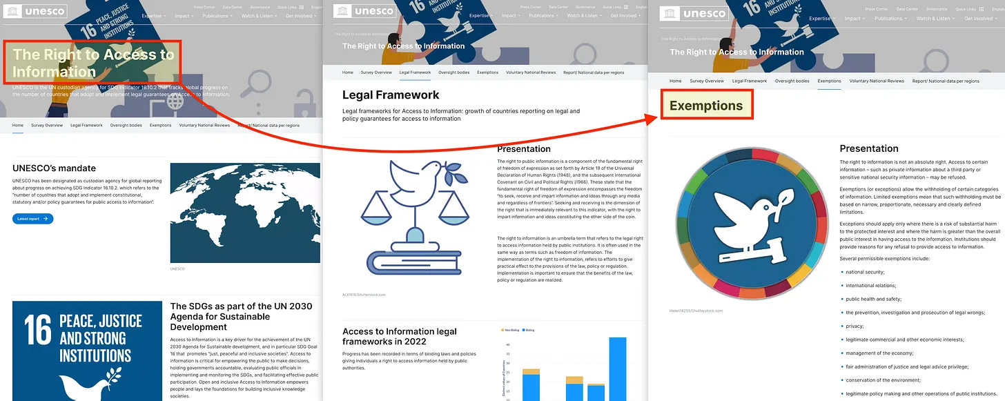 Αλλά η υπόσχεση για «πρόσβαση στην πληροφόρηση» δεν σημαίνει ότι, ας πούμε, η UNESCO θεωρεί όλες τις πληροφορίες «σχετικές με εσάς», ούτε ότι δεν ισχύουν «εξαιρέσεις». Και όσον αφορά το τελευταίο, η παγκόσμια επιτήρηση υψηλής ανάλυσης απαιτεί πρόσβαση στο διαδίκτυο υψηλής ταχύτητας - η οποία θα διευκολυνθεί σιωπηρά μέσω αυτής της πρωτοβουλίας.