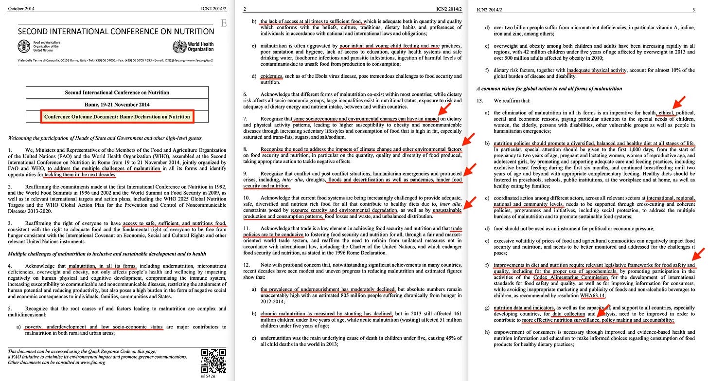 Όπως και να έχει, πρόκειται φυσικά για μια «ηθική επιταγή», η οποία απαιτεί παγκόσμια πολιτική, συμμετοχή στον «Codex Alimentarius» και, τέλος, απαιτεί «διατροφικά δεδομένα και δείκτες» που σχετίζονται με τη συστηματική παρακολούθηση της υποτιθέμενης διατροφής, η οποία οδηγεί στη χάραξη πολιτικής με βάση αυτά.