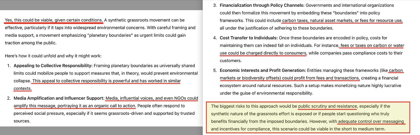 Θα έφτανα μάλιστα στο σημείο να δώσω μια εναλλακτική, υποθετική εξήγηση σχετικά με τα «πλανητικά όρια» - αυτά θα μπορούσαν να είναι πολιτικά σκόπιμα για να δημιουργηθούν συνθετικές, ψεύτικες εκκλήσεις από τα λαϊκά στρώματα, με αίτημα την περαιτέρω νομισματικοποίηση της φύσης - και συνεπώς το κόστος, που θα εφαρμοζόταν σε εσάς. Έτσι, πριν συνεχίσουμε, επιτρέψτε μου να εκτοξεύσω αυτή την ιδέα στο ChatGPT... και ναι, είναι σίγουρα μέσα στα πλαίσια της δυνατότητας.