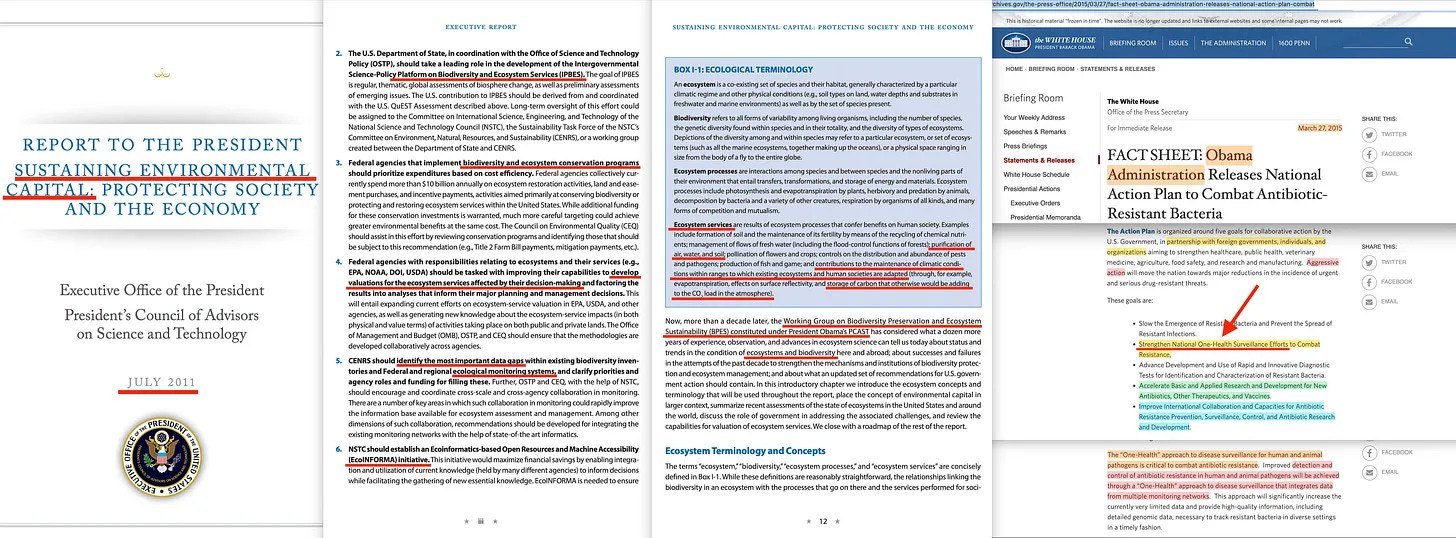 ... ο λόγος είναι ότι αυτό ακολουθήθηκε το 2015 από τον Ομπάμα που ζήτησε την επιτήρηση της μικροβιακής αντοχής, χρησιμοποιώντας μια «προσέγγιση της Ενιαίας Υγείας» [22]. Παρεμπιπτόντως, ο «πρόεδρος χωρίς σκάνδαλα» το 2011 ζήτησε επίσης την προστασία του «φυσικού κεφαλαίου» και των «οικοσυστημικών υπηρεσιών» [23] , ευθυγραμμιζόμενος με τους ΣΒΑ (Στόχοι Βιώσιμης Ανάπτυξης) γενικώς, αλλά και με την οπτική γωνία της νομισματοποίησης, και έτσι λειτουργώντας περαιτέρω διευκρινιστικά, αν υπήρχε οποιαδήποτε αμφιβολία για το πόσο άγιος ήταν πραγματικά.