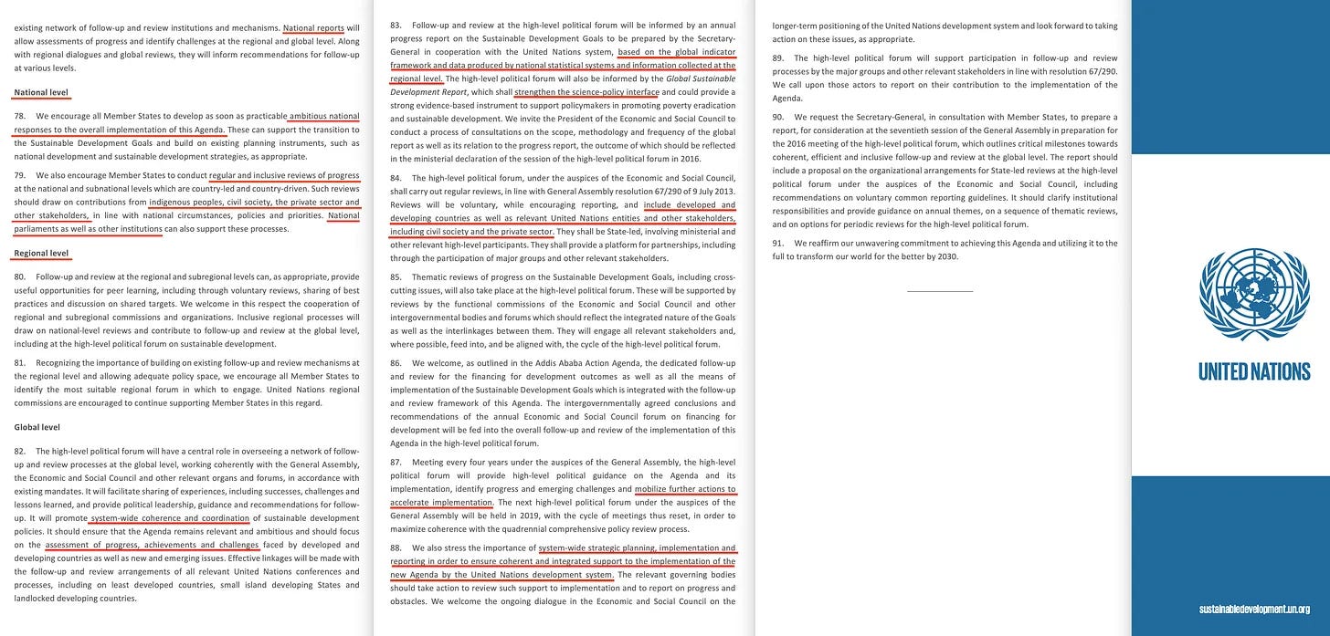«Καθώς η εθνική ιδιοκτησία είναι το κλειδί για την επίτευξη της βιώσιμης ανάπτυξης, τα αποτελέσματα των διαδικασιών σε εθνικό επίπεδο θα αποτελέσουν τη βάση για τις αναθεωρήσεις σε περιφερειακό και παγκόσμιο επίπεδο, δεδομένου ότι η παγκόσμια αναθεώρηση θα βασίζεται κυρίως σε εθνικές επίσημες πηγές δεδομένων».