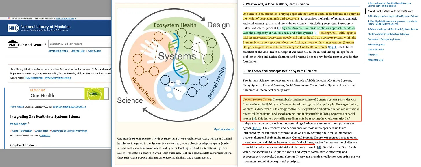 H “Ενιαία Υγεία” (One Health) είναι ένα άλλο παράδειγμα συστημικής σκέψης [12] , το οποίο παρασύρει περαιτέρω τη Γενική Θεωρία Συστημάτων, την οποία προσωπικά προτιμώ να αποδίδω στον Kenneth Boulding, ο οποίος πέρα από το έγγραφο του 1956 που δομούσε την GST του Bertanalffy μέσα σε μια ιεραρχία, “Ο Σκελετός της Επιστήμης” («The Skeleton of Science»), έγραψε επίσης το έγγραφο του 1966, «The Economics of the coming Spaceship Earth» [13] , με κλειστά συστήματα, αποτελώντας έτσι έναν πρώιμο πρόδρομο της Κυκλικής Οικονομίας.