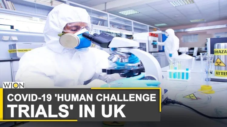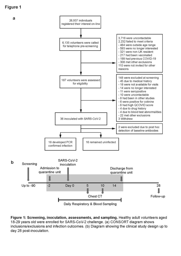 Για τη δημιουργία ενός νέου μοντέλου πρόκλησης «SARS-CoV-2» στον άνθρωπο, 36 εθελοντές ηλικίας 18-29 ετών χωρίς ενδείξεις προηγούμενης λοίμωξης ή εμβολιασμού εμβολιάστηκαν ενδορρινικά με 10 TCID50 ενός «άγριου τύπου ιού» (SARS-CoV-2/human/GBR/484861/2020).