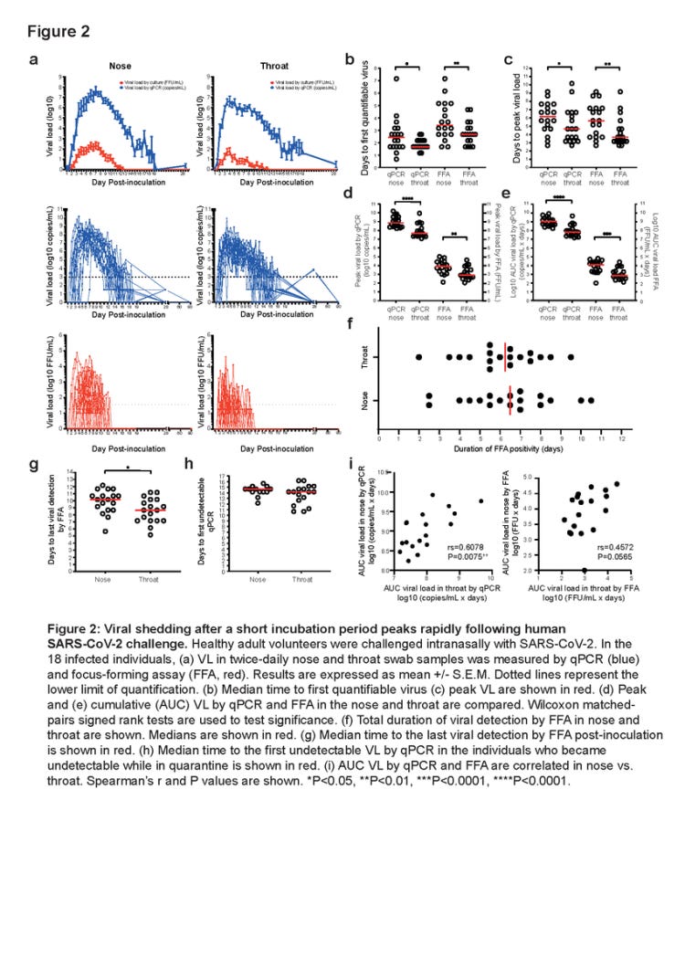 Στα 18 μολυσμένα άτομα, η ιϊκή αποβολή με qPCR έγινε μετρήσιμη σε επιχρίσματα λαιμού από 40 ώρες (διάμεσος όρος, 95% CI [40,52]) (~1,67 ημέρες) μετά τον εμβολιασμό, σημαντικά νωρίτερα από ό,τι στη μύτη (p=0,0225, όπου η αρχική ποσοτικοποιήσιμη ανίχνευση του ιού πραγματοποιήθηκε 58 ώρες (95% CI [40,76]) (~2,4 ημέρες) μετά τον εμβολιασμό (Σχήματα 2α & 2β). Αυτό αρχικά συνοδεύτηκε από βιώσιμο ιό που μετρήθηκε με τη μέθοδο focus forming assay (FFA), ο οποίος επίσης ανιχνεύθηκε ποσοτικά νωρίτερα στο λαιμό από ό,τι στη μύτη (p=0,0058, Σχήμα 2β). Τα ιϊκά φορτία (VL) αυξήθηκαν ραγδαία στη συνέχεια, με το qPCR να κορυφώνεται στο λαιμό στις 112 ώρες (95% CI [76,160]) (~4,7 ημέρες) μετά τον εμβολιασμό και αργότερα στις 148 ώρες (95% CI [112,184]) (~6,2 ημέρες) μετά τον εμβολιασμό στη μύτη (Εικόνα 2α & 2γ). Ωστόσο, στην κορυφή του, το VL ήταν σημαντικά υψηλότερο στα ρινικά δείγματα στα 8,87 (95% CI [8,41,9,53]) log10 αντίγραφα/mL και 3,9 (95% CI [3,34,4,42]) log10 FFU/mL από ό,τι στο λαιμό στα 7,65 (95% CI [7,39,8, 24]) log10 αντίγραφα/mL και 2,92 (95% CI [2,68,3,56]) log10 FFU/mL (p<0,0001 για qRT-PCR και p=0,0024 για FFA, Σχήμα 2δ).