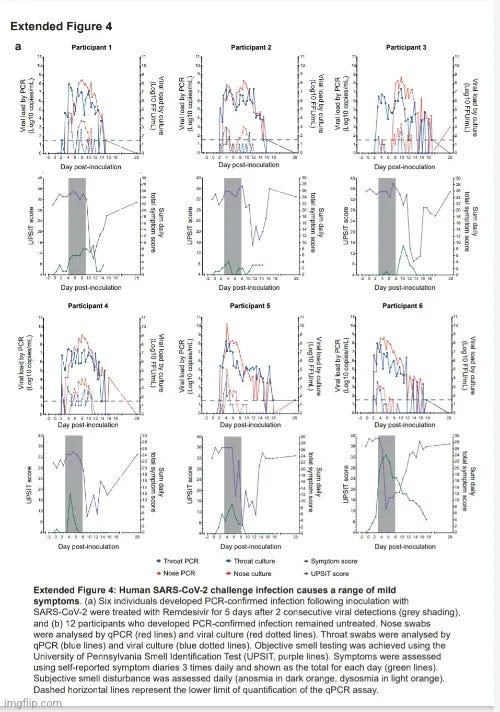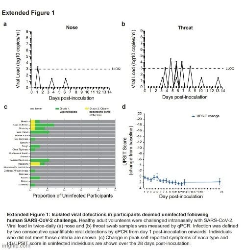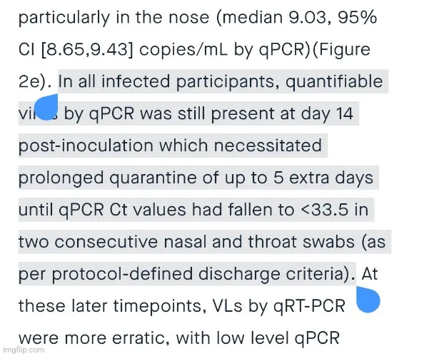 (δηλαδή, βρήκαν το καλλιεργημένο γενετικό υλικό στην μύτη των 18 συμμετεχόντων... σοκαριστικό...)Σε όλους τους μολυσμένους συμμετέχοντες, ο ποσοτικοποιήσιμος «ιός» με qPCR ήταν ακόμα παρών την 14η ημέρα μετά τον εμβολιασμό, γεγονός που επέβαλε παρατεταμένη καραντίνα έως και 5 επιπλέον ημέρες, έως ότου οι τιμές qPCR Ct μειώθηκαν σε <33,5 σε δύο διαδοχικά επιχρίσματα από τη μύτη και το λαιμό (σύμφωνα με τα κριτήρια εξόδου που ορίζονται στο πρωτόκολλο).