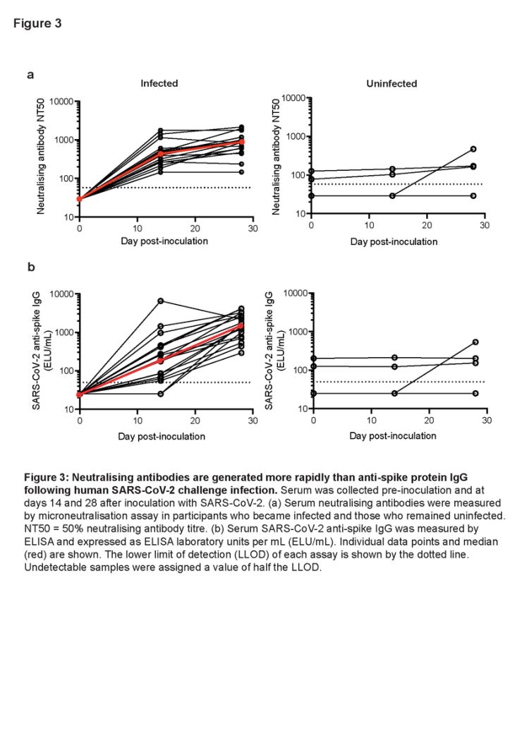 Η ταχεία εμφάνιση της λοίμωξης αντανακλάται στις αντισωματικές αποκρίσεις του ορού. Δεν παρατηρήθηκε αύξηση των αντισωμάτων του ορού με μικροουδετεροποίηση ή ELISA IgG κατά της πρωτεΐνης spike σε όσους θεωρήθηκαν μη μολυσμένοι, ακόμη και σε περιπτώσεις όπου είχαν ανιχνευθεί μεμονωμένα ιϊκά σωματίδια, με εξαίρεση έναν συμμετέχοντα που προσβλήθηκε από φυσικό COVID-19 μετά την έξοδο από την καραντίνα (Σχήματα 3α & 3β). Αντίθετα, αντισώματα στον ορό δημιουργήθηκαν σε όλους τους μολυσμένους συμμετέχοντες με τίτλους εξουδετερωτικών αντισωμάτων 425 (διάμεσος, IQR 269) 14 ημέρες μετά τον εμβολιασμό και περαιτέρω αύξηση σε 863,5 (IQR 403) στις 28 ημέρες (Σχήμα 3α). Παρατηρήθηκε βραδύτερη αύξηση στα IgG που συνδέονται με την πρωτεΐνη spike, όπως μετρήθηκε με ELISA, με μέση αύξηση στα 192,5 (IQR 393,1) ELU/mL την 14η ημέρα, ακολουθούμενη από αύξηση την 28η ημέρα στα 1549 (IQR 1865) ELU/mL (Σχήμα 3β). Αξίζει να σημειωθεί ότι στους δύο συμμετέχοντες που παρουσίασαν ορομετατροπή μεταξύ της διαλογής και της εμβολιασμού, τόσο τα εξουδετερωτικά αντισώματα όσο και τα αντισώματα που συνδέονται με την πρωτεΐνη S ήταν ανιχνεύσιμα κατά την εισαγωγή τους στη μονάδα καραντίνας την ημέρα -2 πριν από τον εμβολιασμό. Και τα δύο άτομα αποκλείστηκαν από την ανάλυση του ποσοστού μόλυνσης σύμφωνα με το πρωτόκολλο, αλλά παρέμειναν μη μολυσμένα, χωρίς αλλαγή στα επίπεδα των αντισωμάτων στον ορό τους μετά τον εμβολιασμό.
