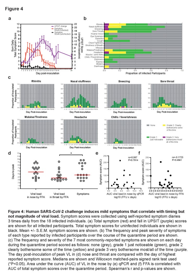 Συνολικά, αυτά τα ευρήματα υποδεικνύουν ότι η έκθεση του ανθρώπου στον «SARS-CoV-2» σε αυτή τη δόση εμβολίου έχει χαμηλό κίνδυνο να προκαλέσει σοβαρά συμπτώματα σε υγιείς νεαρούς ενήλικες, αλλά οδηγεί σε μεγάλες ποσότητες «ιού» στον ρινοφάρυγγα, ακόμη και χωρίς την παρουσία αναπνευστικής ή συστηματικής νόσου
