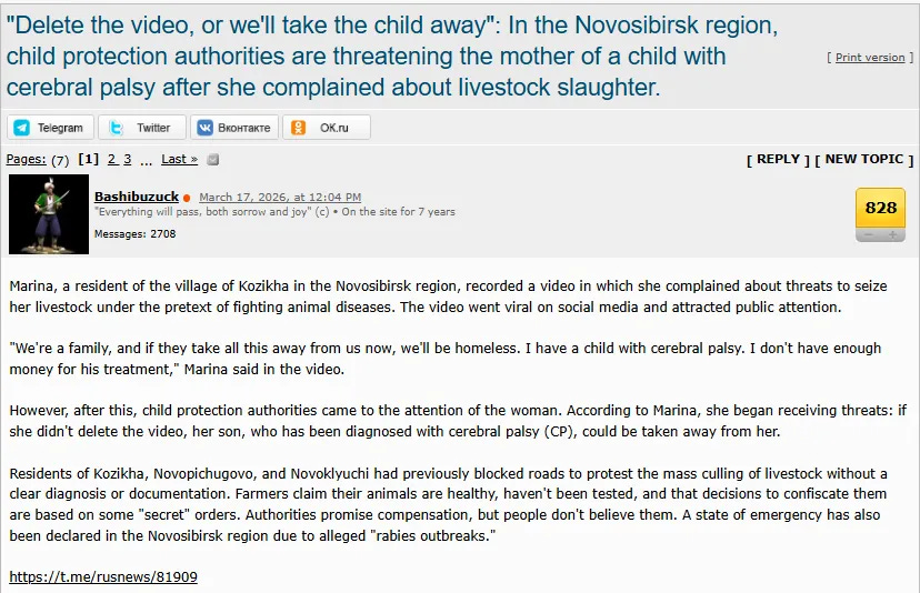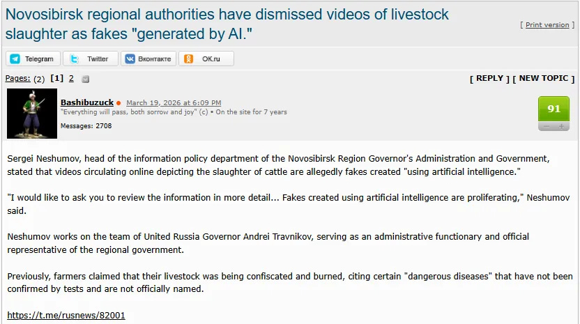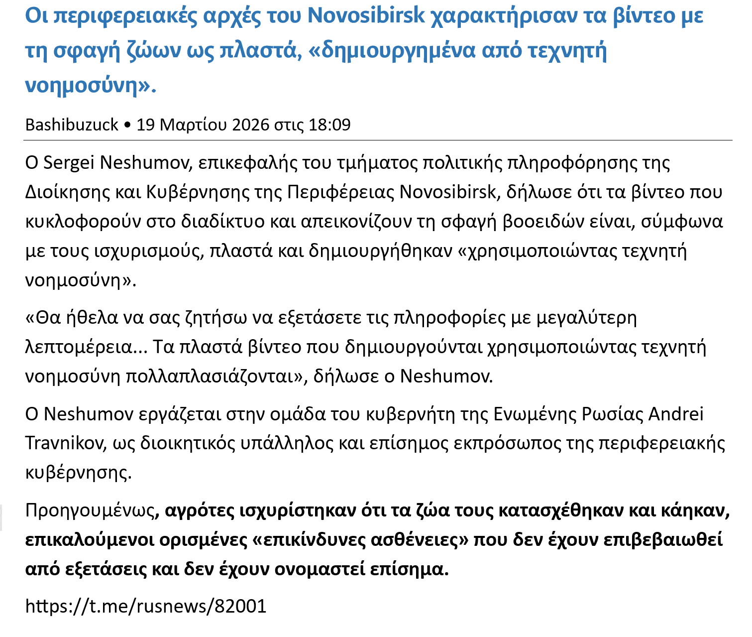 Ο κυβερνήτης της Περιφέρειας Novosibirsk, Αντρέι Τραβνίκοφ, χαρακτήρισε τη μαζική σφαγή ζώων «ένα αυστηρό αλλά απαραίτητο κτηνιατρικό μέτρο». Αυτό είναι κάτι συνηθισμένο για τους «ηγέτες» της Ρωσίας. Οι αξιωματούχοι του Πούτιν δεν έχουν συνηθίσει να αναλαμβάνουν την ευθύνη. Δεν θα ακούσουμε ποτέ την αλήθεια από αυτούς. Διότι τα παραμύθια για τη σφαγή βοοειδών λόγω παστερελλώσεως δεν αντέχουν σε προσεκτική εξέταση.
