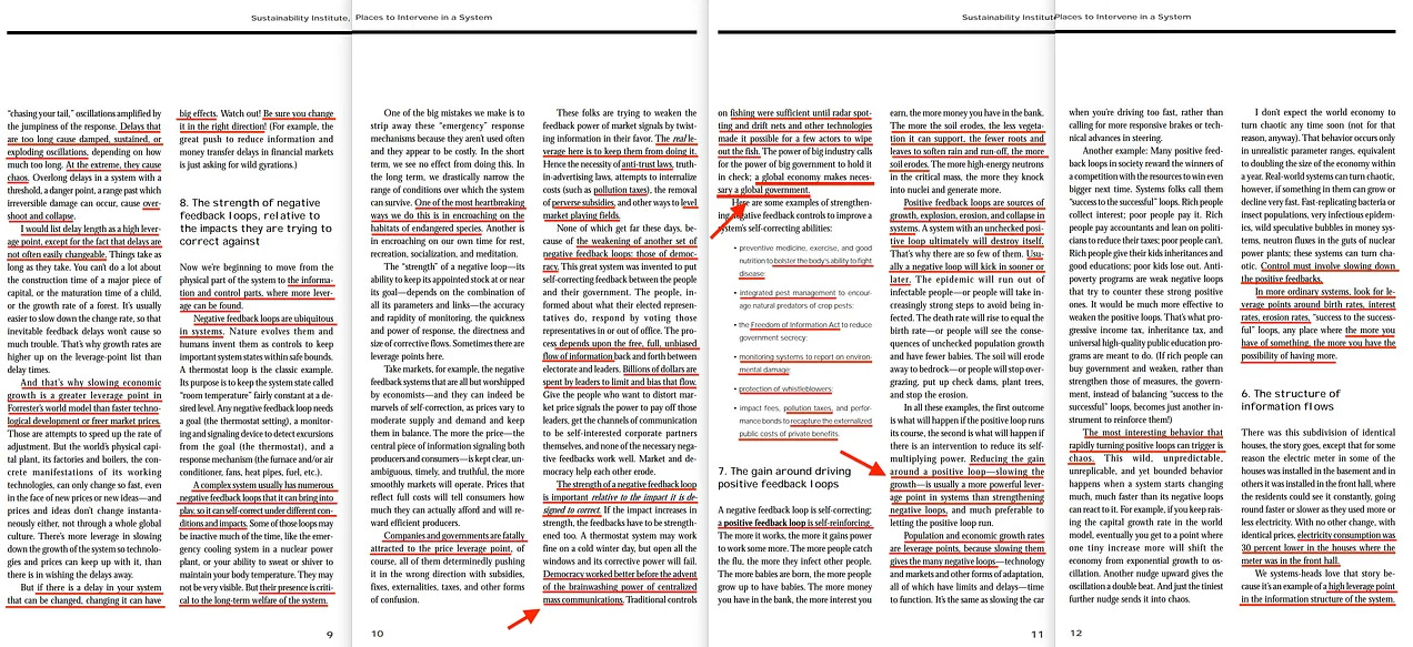 Η πραγματική δύναμη που σχετίζεται με τους αρνητικούς βρόχους ανατροφοδότησης αφορά την επιβράδυνσή τους, εμποδίζοντας έτσι το σύστημα να αυτορυθμιστεί. Και το να αφήνουμε τα συστήματα θετικής ανατροφοδότησης να λειτουργούν ανεξέλεγκτα μπορεί να οδηγήσει σε χάος. Αλλά επιπλέον - «Η μείωση του κέρδους γύρω από έναν θετικό βρόχο - η επιβράδυνση της ανάπτυξης - είναι συνήθως ένα πιο ισχυρό σημείο μόχλευσης στα συστήματα από την ενίσχυση των αρνητικών βρόχων, και είναι πολύ προτιμότερη από το να αφήνουμε τον θετικό βρόχο να λειτουργεί».