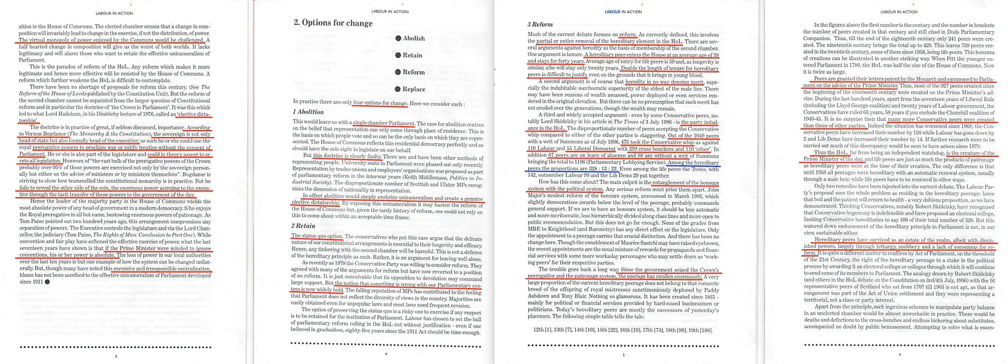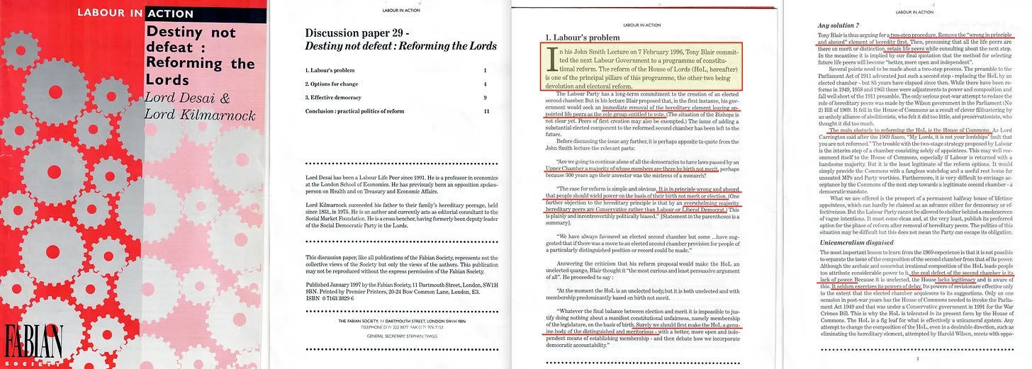 Φυσικά, το 2023 η Fabian Society πρότεινε ότι η Τράπεζα της Αγγλίας θα έπρεπε να αποκτήσει αντιδημοκρατική επιρροή στη δημοσιονομική πολιτική, αλλά ας το αφήσουμε αυτό στην άκρη και ας επικεντρωθούμε αντ’ αυτού στον «Τρίτο Δρόμο» του Τόνι Μπλερ, ο οποίος στην πραγματικότητα δεν ήταν τίποτα λιγότερο από επαναστατικός, αντιπροσωπεύοντας μια σύγχρονη επανερμηνεία της Νέας Οικονομικής Πολιτικής του Λένιν, πλαισιωμένη με εξαιρετικά παραπλανητικό τρόπο. Όσον αφορά όμως την πολιτική, ένα από τα πρώτα πράγματα που επιδίωξε ο Blair ήταν η μεταρρύθμιση της Βουλής των Λόρδων.