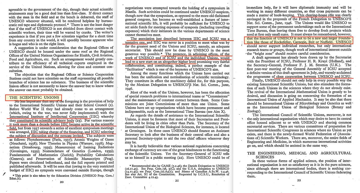 Αλλά βρίσκουμε περαιτέρω μια ενότητα με τίτλο «Οι επιστημονικές Ενώσεις», η οποία δεν περιλαμβάνει μόνο αναφορά στο ICSU, αλλά επιπλέον «... το Διεθνές Ινστιτούτο Πνευματικής Συνεργασίας (IIIC), με το οποίο συγκρότησαν το επιστημονικό συμβουλευτικό του όργανο».