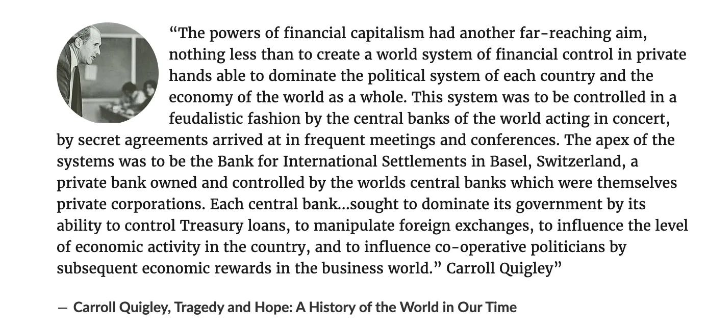 Το απόλυτα τρελό μέρος αυτού του ταξιδιού είναι ότι αποδεικνύει επίσης ότι ο Carroll Quigley, λογικά, είχε απόλυτο δίκιο. Η κορυφή αυτού του συστήματος βρίσκεται πράγματι στη Βασιλεία, με την Τράπεζα Διεθνών Διακανονισμών να λειτουργεί ως ο κεντρικός κόμβος της παγκόσμιας οικονομικής εξουσίας. Η ανάλυση του Quigley σχετικά με το κέντρο των παγκόσμιων τραπεζικών ιδρυμάτων και την επιρροή τους στην παγκόσμια διακυβέρνηση επιβεβαιώνεται από τον τρόπο με τον οποίο αυτές οι χρηματοπιστωτικές δομές συνεχίζουν να λειτουργούν στα υψηλότερα επίπεδα.
