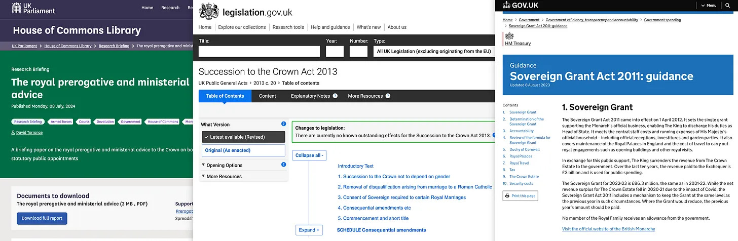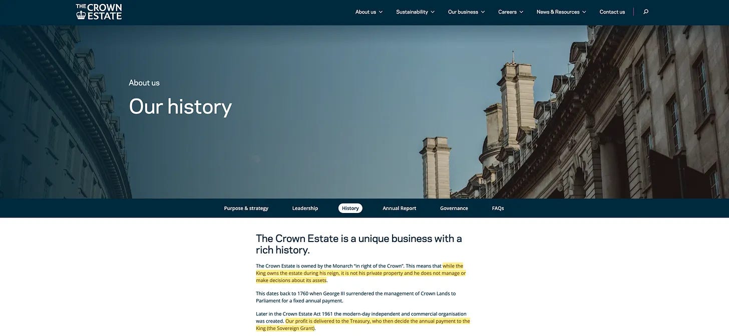 Και παρεμπιπτόντως, παρά τους υπερβολικούς ισχυρισμούς περί πλούτου, η Βασιλική Οικογένεια δεν κατέχει στην πραγματικότητα το Crown Estate [44]. Το Crown Estate είναι μια ξεχωριστή οντότητα, με τα κέρδη να πηγαίνουν στην κυβέρνηση, και η Βασιλική Οικογένεια λαμβάνει μόνο ένα μέρος αυτών των κερδών μέσω του συστήματος Sovereign Grant [45] για τη χρηματοδότηση των επίσημων καθηκόντων της.