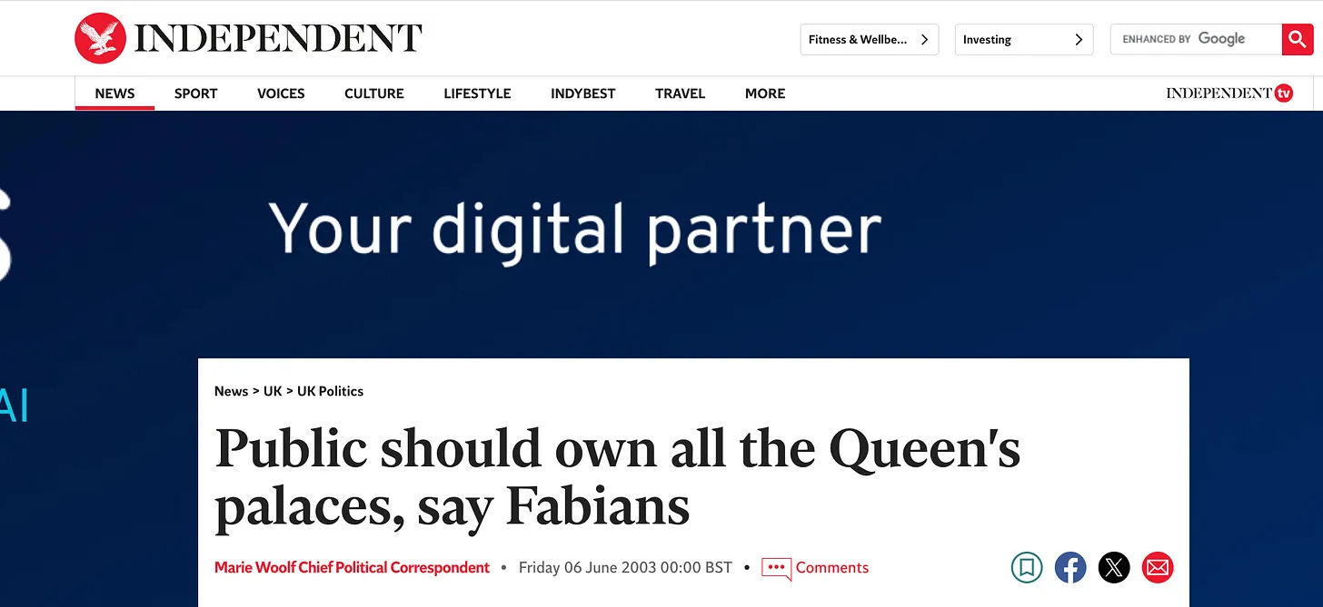 Και το ότι η Βασιλική Οικογένεια «δεν πρέπει να κατέχει τίποτα και να είναι ευτυχισμένη» δεν θα πρέπει να αποτελεί έκπληξη, δεδομένου ότι οι Φαβιανοί δήλωσαν ακριβώς το ίδιο το 2003 [46].