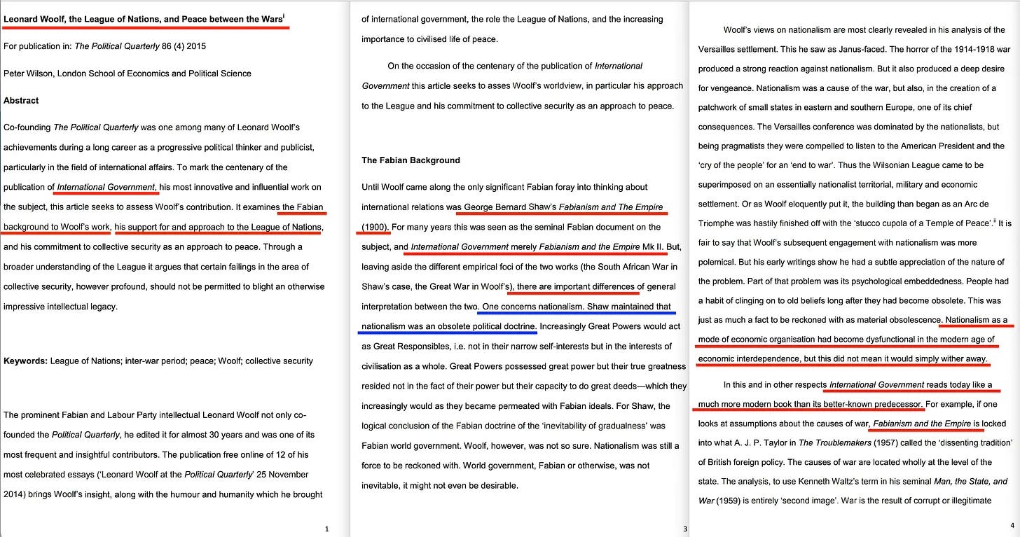 Αυτό το άρθρο του 2015 τιτλοφορείται «Leonard Woolf, the League of Nations and peace between the wars» [63] , και στην ενότητα «The Fabian Background» βρίσκουμε -