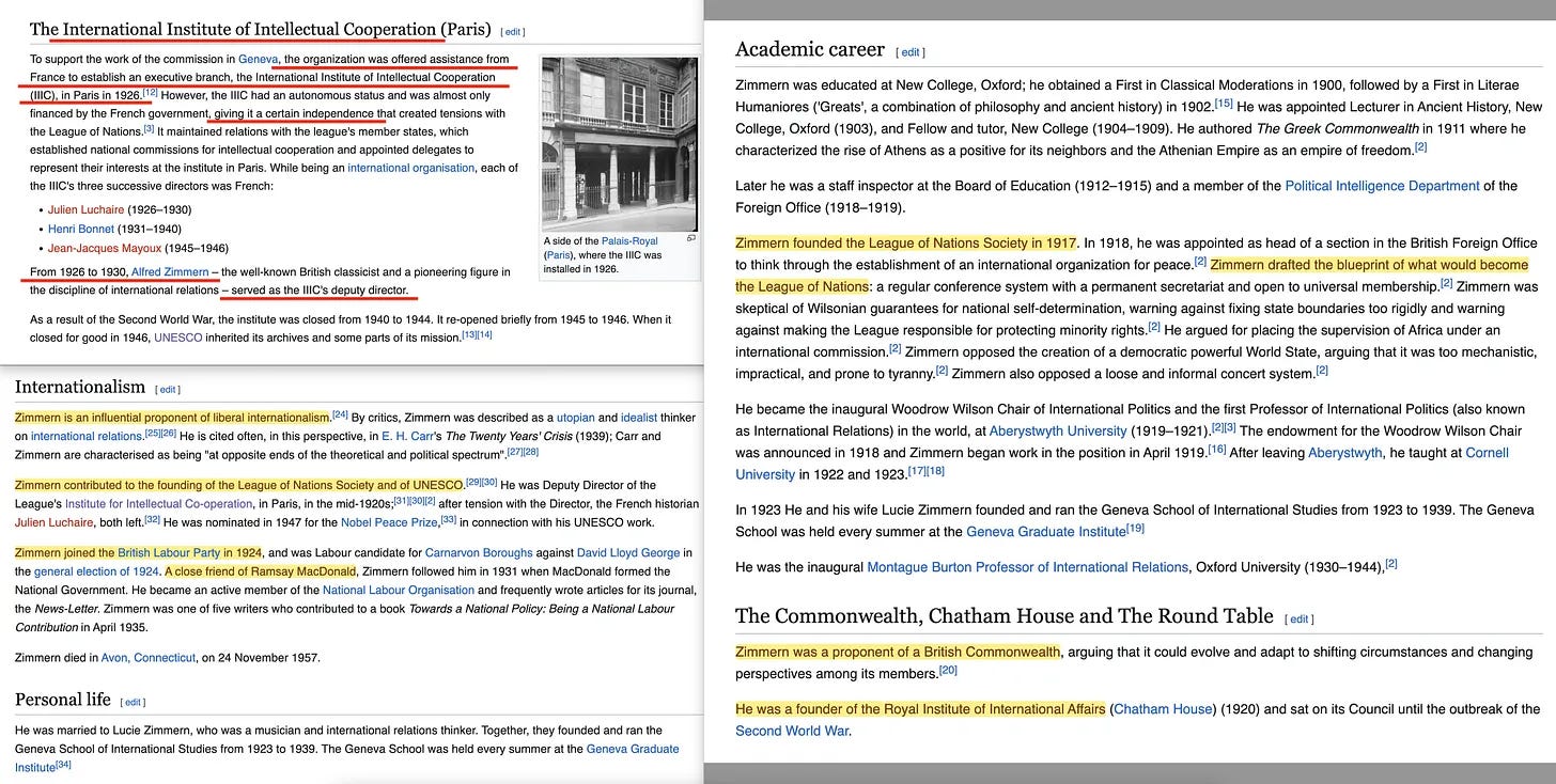 Η IIIC σχετίζεται με τη Διεθνή Επιτροπή για τη Διανοητική Συνεργασία [56] , στην οποία ήταν μέλος ακόμη και ο Albert Einstein. Και μεταξύ 1926-1930, η IIIC είχε επικεφαλής τον Alfred Zimmern [57], υπέρμαχο της Βρετανικής Κοινοπολιτείας, ο οποίος όχι μόνο συνέβαλε στην ίδρυση της Κοινωνίας των Εθνών και της UNESCO, αλλά ήταν επίσης συνιδρυτής του Βασιλικού Ινστιτούτου Διεθνών Υποθέσεων ή αλλιώς Chatham House. Επιπλέον, ήταν στενός φίλος του πρωθυπουργού του Ηνωμένου Βασιλείου και σοσιαλιστή Φαβιανός - Ramsay McDonald [58], και ακόμη -