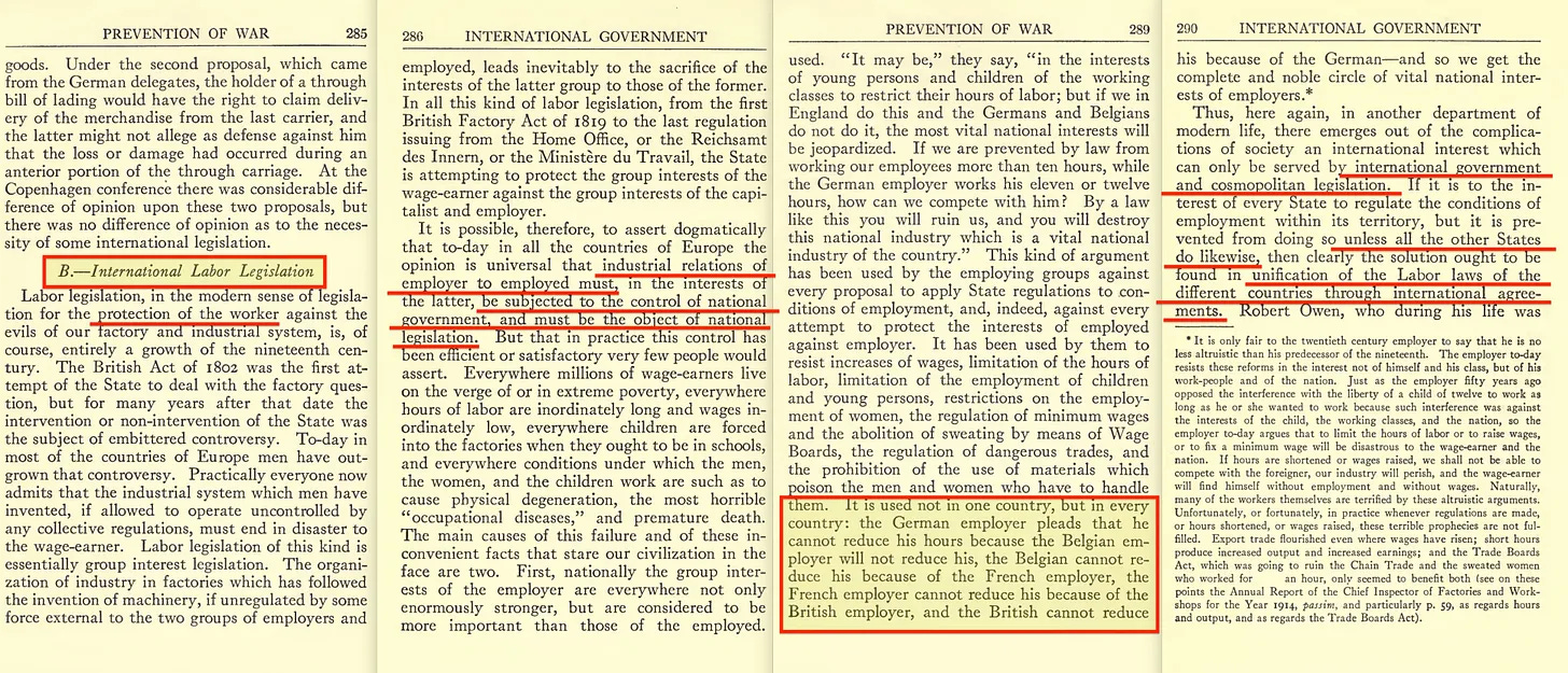 «Χρησιμοποιείται όχι σε μία χώρα, αλλά σε κάθε χώρα: ο Γερμανός εργοδότης επικαλείται ότι δεν μπορεί να μειώσει τις ώρες εργασίας του επειδή ο Βέλγος εργοδότης δεν θα μειώσει τις δικές του, ο Βέλγος... αναδύεται μέσα από τις περιπλοκές της κοινωνίας ένα διεθνές συμφέρον που μπορεί να εξυπηρετηθεί μόνο από τη διεθνή κυβέρνηση και την κοσμοπολίτικη νομοθεσία. Αν είναι προς το συμφέρον κάθε κράτους να ρυθμίσει τους όρους εργασίας στην επικράτειά του, αλλά δεν μπορεί να το κάνει αν δεν το κάνουν όλα τα άλλα κράτη, τότε σαφώς η λύση θα έπρεπε να βρεθεί στην ενοποίηση των εργατικών νόμων των διαφόρων χωρών μέσω διεθνών συμφωνιών».