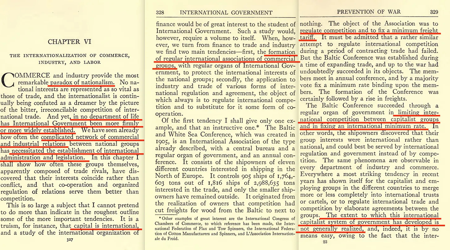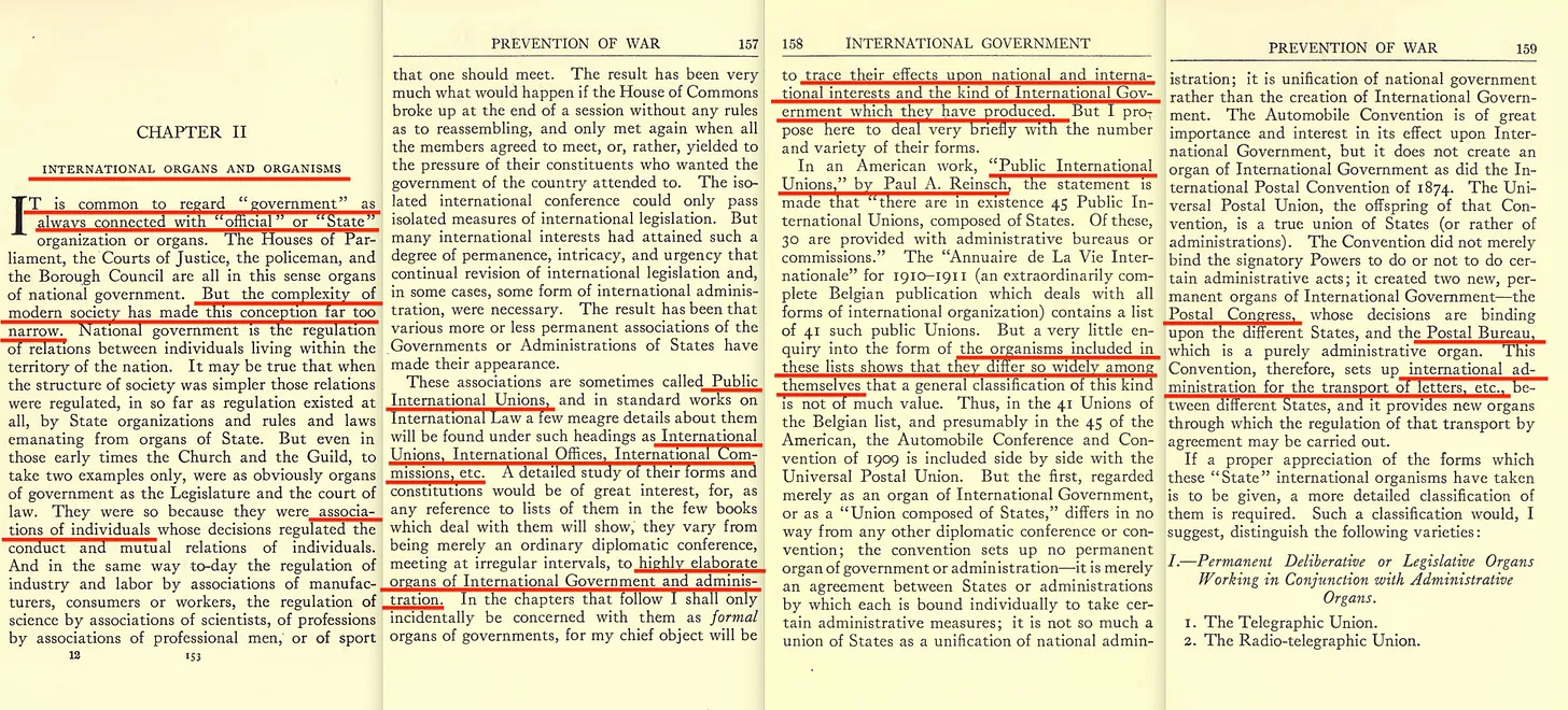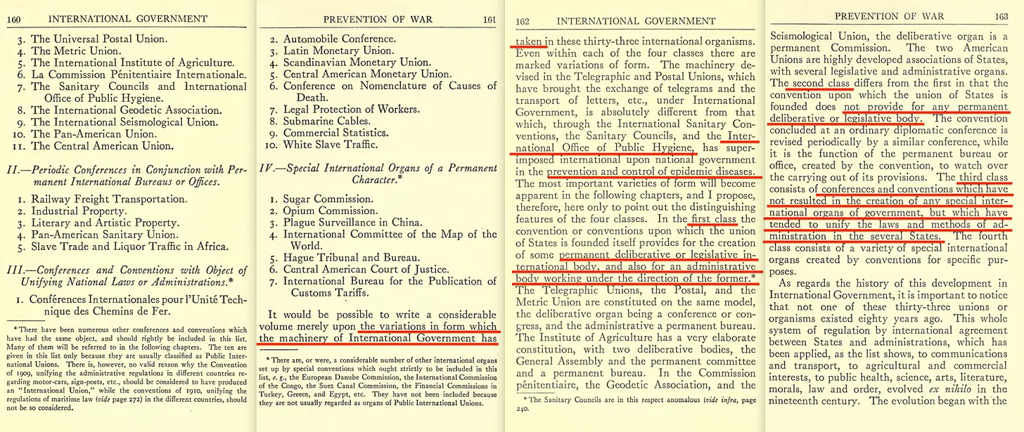 «... αυτό που σήμερα θα ονομάζαμε »παγκόσμια διακυβέρνηση«, υπήρχε όταν δημιουργήθηκε η Κοινωνία των Εθνών... Η «κοσμοπολίτικη διεθνής διακυβέρνηση» εκδηλώθηκε με τη σύσταση ενός ευρέος φάσματος επιτροπών και επιτροπών της Κοινωνίας, που συχνά αποτελούνταν από εμπειρογνώμονες και όχι από τους συνήθεις εκπροσώπους των κρατών... την οργάνωση της οικονομικής και κοινωνικής ζωής του κόσμου... και την οργάνωση της πολιτικής του ζωής»