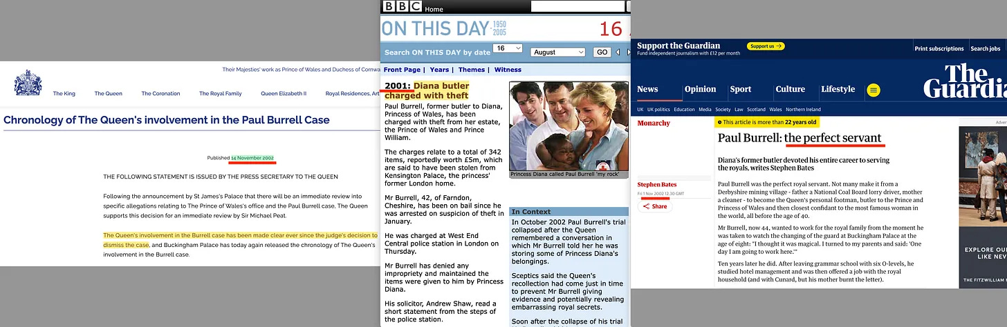 Και δεν άργησε να ξεσπάσει ένα σκάνδαλο μετά την ψήφιση της μεταρρύθμισης της Βουλής των Λόρδων το 199921 , στο οποίο εμπλέκεται ο Butler, Paul Burrell, ο οποίος κατηγορήθηκε ότι πήρε αντικείμενα από μια βασιλική κατοικία [22]. Η υπόθεση κατέρρευσε τελικά, αφού η Βασίλισσα [23] έδωσε προσωπικά λεπτομερή απολογισμό [24] που τον αθώωσε. Παρόλο που η υπόθεση κατέρρευσε, γυρίστηκε ντοκιμαντέρ για το περιστατικό [25], και ο Burrell, με τυπικό τρόπο, εμφανίστηκε αργότερα στην εκπομπή «I’m a Celebrity - Get me out of here» [26].