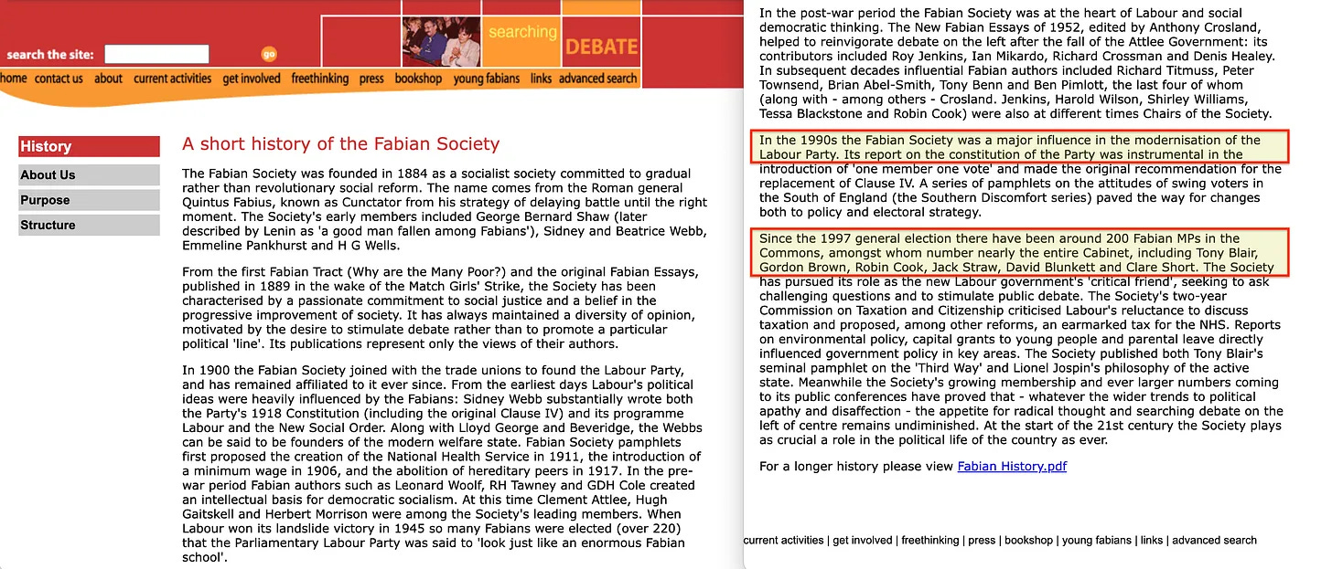 Ο Tony Blair εξελέγη πρωθυπουργός του Ηνωμένου Βασιλείου το 1997. Αν και η θητεία του χαρακτηρίζεται συχνά ως «tory light», η άνοδός του σηματοδότησε στην πραγματικότητα ένα σημαντικό σημείο καμπής στη βρετανική ιστορία, καθώς δίπλα του εξελέγησαν 200 Φαβιανοί Σοσιαλιστές [11] , μεταξύ των οποίων οι Gordon Brown, Robin Cook, Jack Straw, David Blunkett, Clare Short - και Ed Balls [12]. Ήταν η ιδανική στιγμή για να προωθήσουν ριζοσπαστικές μεταρρυθμίσεις, πράγμα που έκαναν - όπως είχε ήδη περιγραφεί λεπτομερώς στο φυλλάδιο των Φαβιάνων (Fabian) του 1998 του Tony Blair «The Third Way» (Ο Τρίτος Δρόμος).