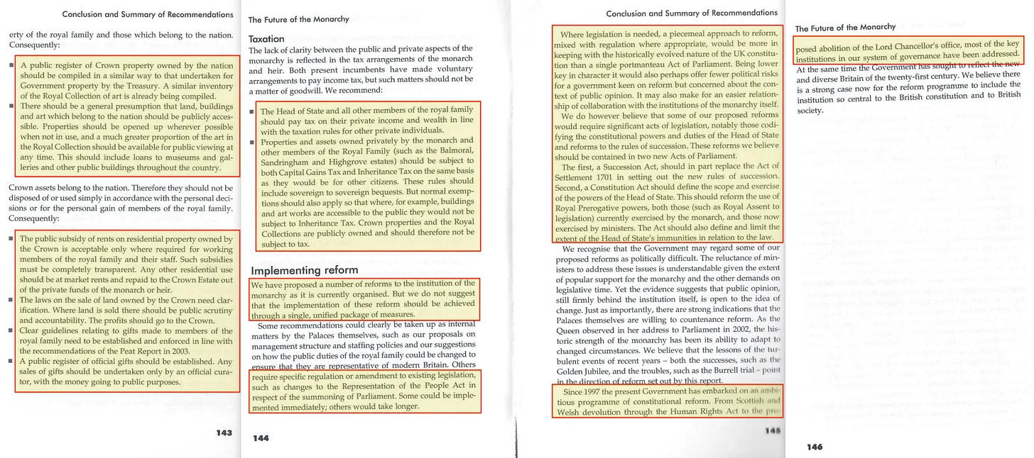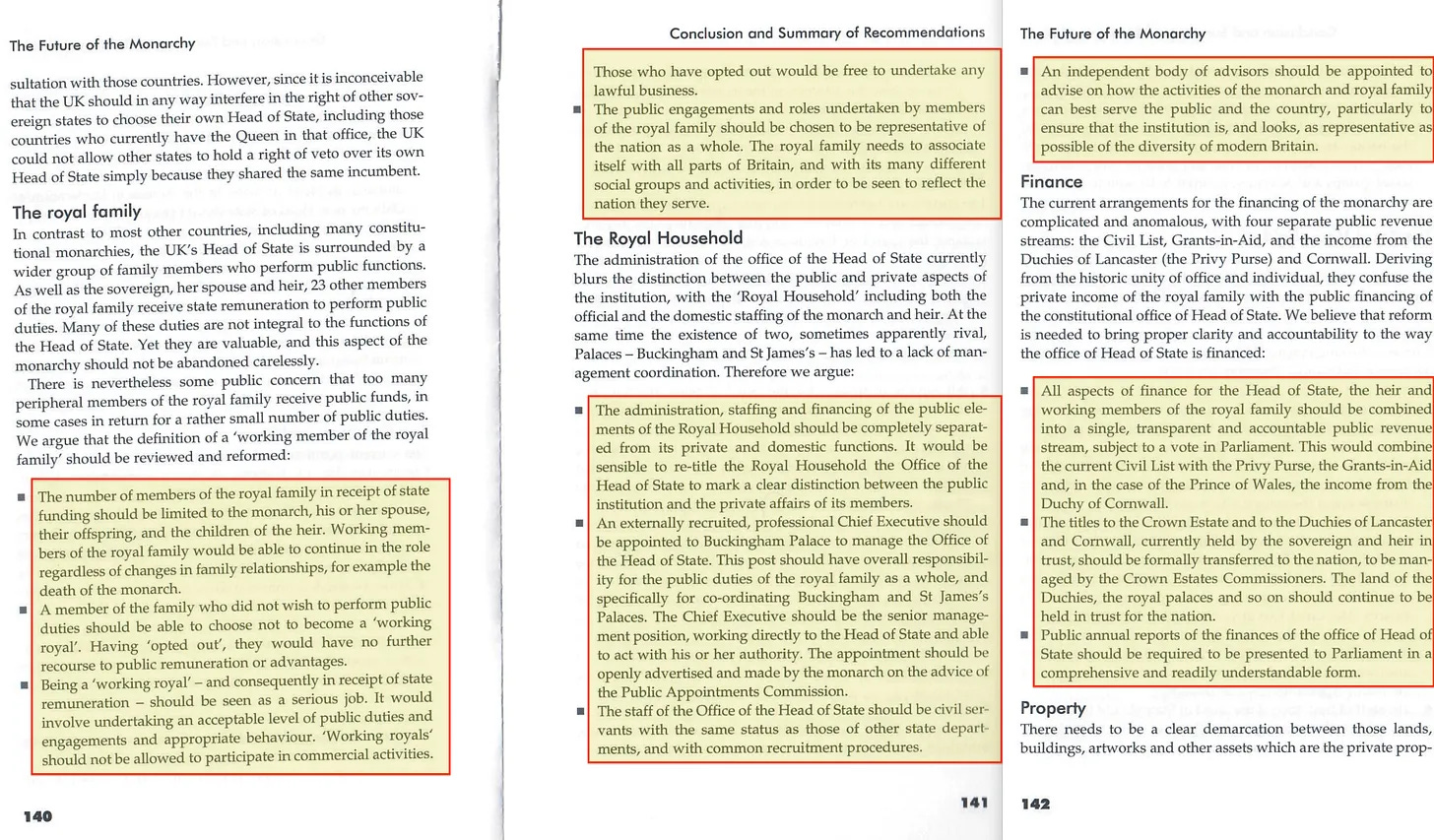 Τα παραπάνω ήταν μόνο οι τελικές συστάσεις. Φανταστείτε το επίπεδο λεπτομέρειας στην υπόλοιπη έκθεση, η οποία εξετάζει σε βάθος τα πάντα, από τις ιδιωτικές επιχειρήσεις της βασιλικής οικογένειας μέχρι τον τρόπο διαχείρισης των οικονομικών και των ακινήτων της. Προσφέρει ακόμη και συγκεκριμένες κατευθυντήριες γραμμές σχετικά με τις δωρεές, τις πωλήσεις γης, τις δημόσιες επιδοτήσεις των ενοικίων και τη φορολογία. Αλλά ελπίζω ότι απέδειξα την άποψή μου-