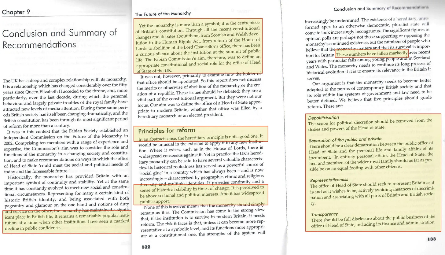 Ξεκινάει δηλώνοντας ότι «η κληρονομική αρχή δεν είναι καλή», κάτι που φαίνεται εύστοχο αν σκεφτεί κανείς ότι μόλις πρόσφατα αφαίρεσαν τους κληρονομικούς ομότιμους από τη Βουλή των Λόρδων. Ωστόσο, η έκθεση παραδέχεται ότι η Μοναρχία απολαμβάνει ευρείας δημόσιας υποστήριξης - αν και «οι αριθμοί αυτοί έχουν μειωθεί αισθητά τα τελευταία χρόνια» - μια μείωση που δεν προκαλεί ιδιαίτερη έκπληξη, δεδομένης της υπόθεσης Paul Burrell.