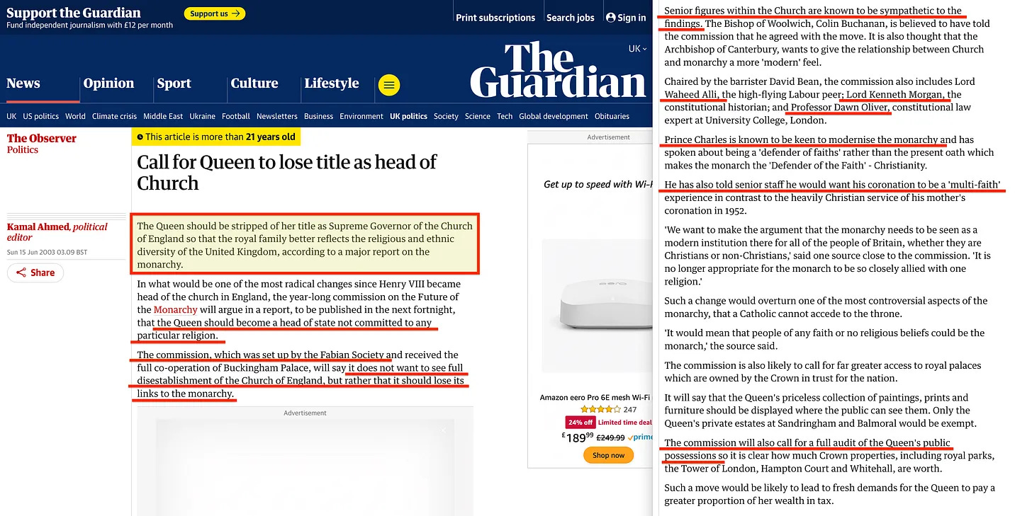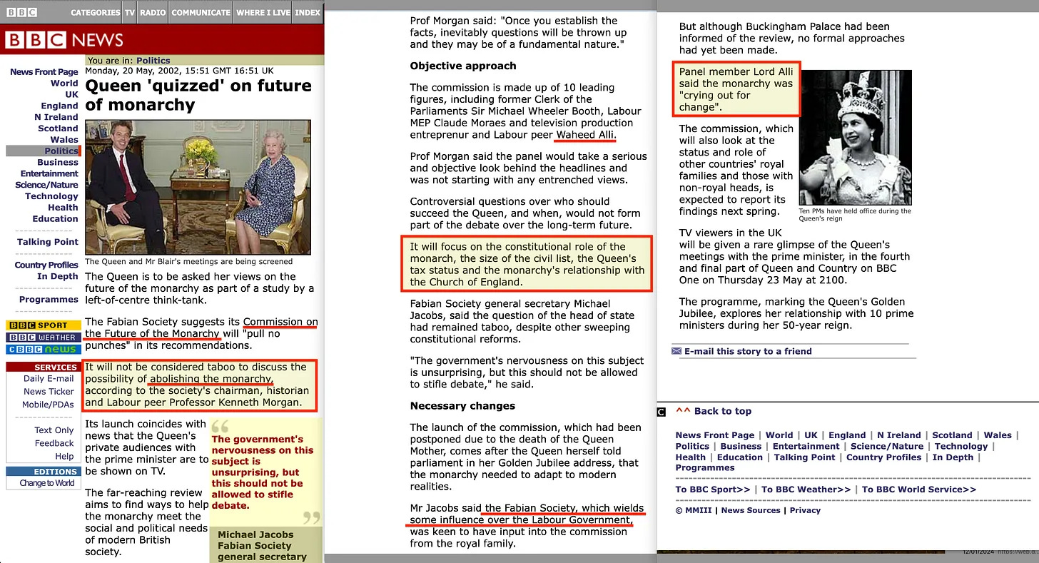 Αυτό που η κυβέρνηση του Tony Blair, εν ολίγοις, διευκόλυνε ήταν η μετατροπή της Βρετανικής Μοναρχίας σε μια συμβολική φιγούρα, μια απλή γαλέρα της παράδοσης. Υπό την ηγεσία του Blair, ο ρόλος της Μοναρχίας μετατοπίστηκε και έγινε όλο και πιο τελετουργικός, αντανακλώντας τη μετάβαση σε αυτό που κάποιοι θα μπορούσαν να ονομάσουν «νέα παγκόσμια τάξη» [47] - ένας όρος που υιοθετήθηκε ακόμη και από την ίδια την Fabian Society.