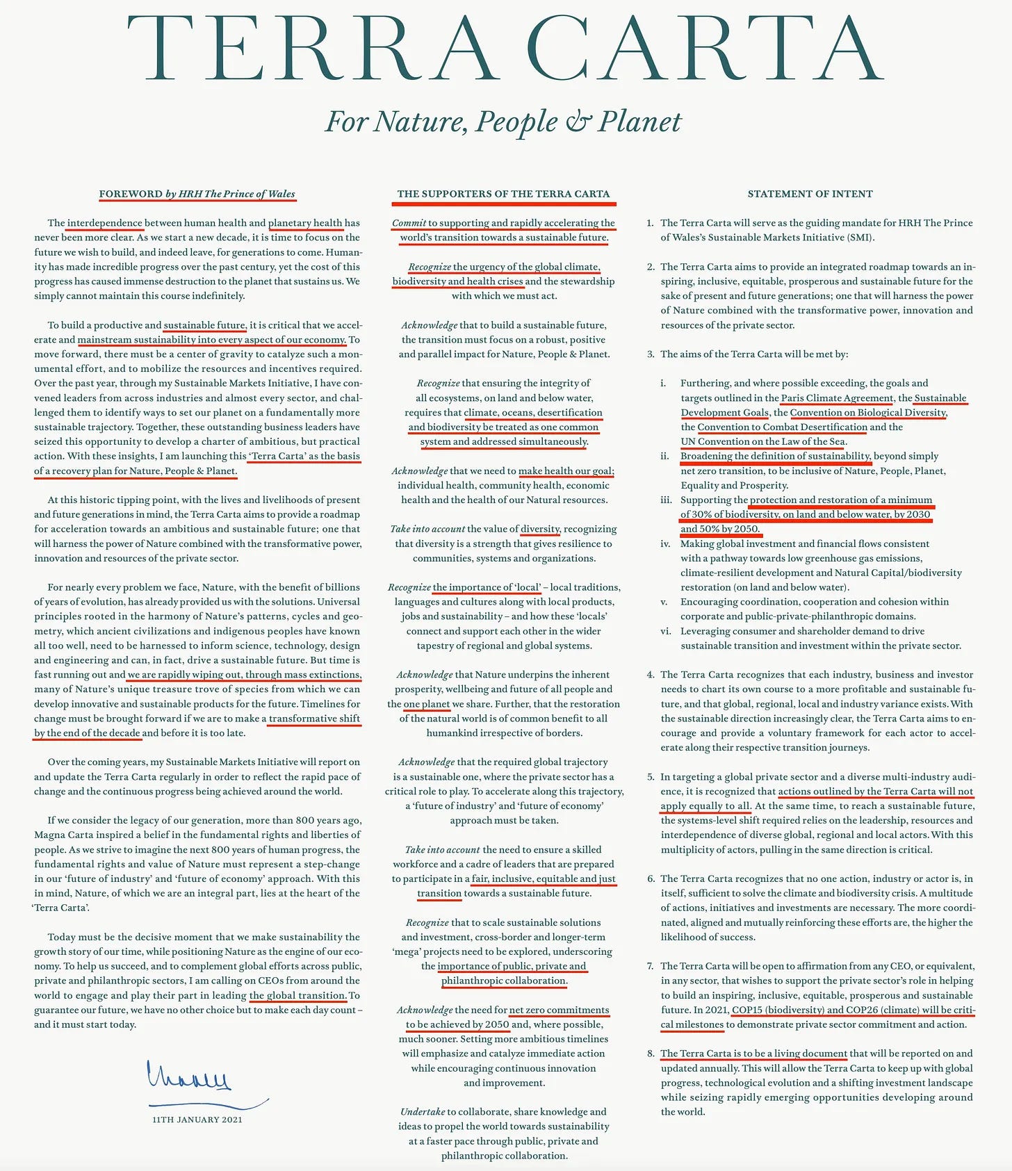 «Στοχεύοντας σε έναν παγκόσμιο ιδιωτικό τομέα και σε ένα ποικίλο πολυκλαδικό κοινό, αναγνωρίζεται ότι οι δράσεις που περιγράφονται από την Terra Carta δεν θα ισχύουν εξίσου για όλους»
