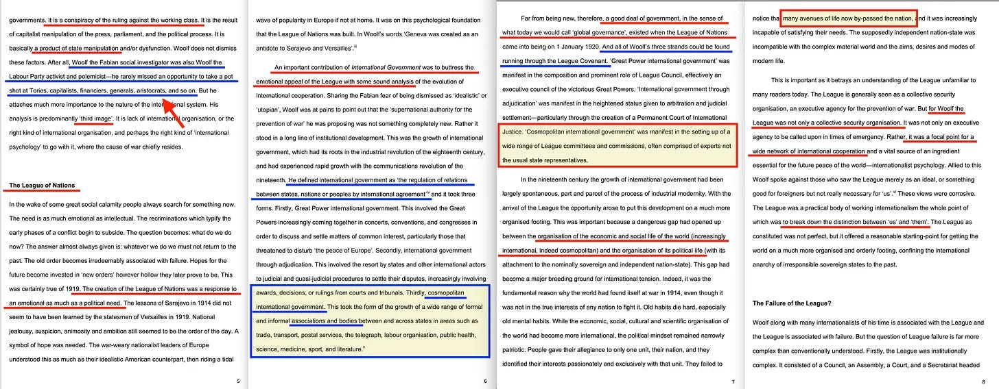 «Μια σημαντική συμβολή της Διεθνούς Κυβέρνησης ήταν να στηρίξει τη συναισθηματική έλξη της Λίγκας με κάποια υγιή ανάλυση της εξέλιξης της διεθνούς συνεργασίας. Συμμεριζόμενος τον φόβο των Φαβιανών να μην απορριφθούν ως «ιδεαλιστές» ή “ουτοπιστές”, ο Woolf φρόντισε να επισημάνει ότι η «υπερεθνική αρχή για την πρόληψη του πολέμου» που πρότεινε δεν ήταν κάτι εντελώς καινούργιο... Όρισε τη διεθνή κυβέρνηση ως «τη ρύθμιση των σχέσεων μεταξύ κρατών, εθνών ή λαών με διεθνή συμφωνία» και έπαιρνε τρεις μορφές... Τρίτον, την κοσμοπολίτικη διεθνή κυβέρνηση. Αυτή πήρε τη μορφή της ανάπτυξης ενός ευρέος φάσματος επίσημων και ανεπίσημων ενώσεων και οργανισμών μεταξύ και μεταξύ κρατών σε τομείς όπως το εμπόριο, οι μεταφορές, οι ταχυδρομικές υπηρεσίες, ο τηλέγραφος, η οργάνωση της εργασίας, η δημόσια υγεία, η επιστήμη, η ιατρική, ο αθλητισμός και η λογοτεχνία»