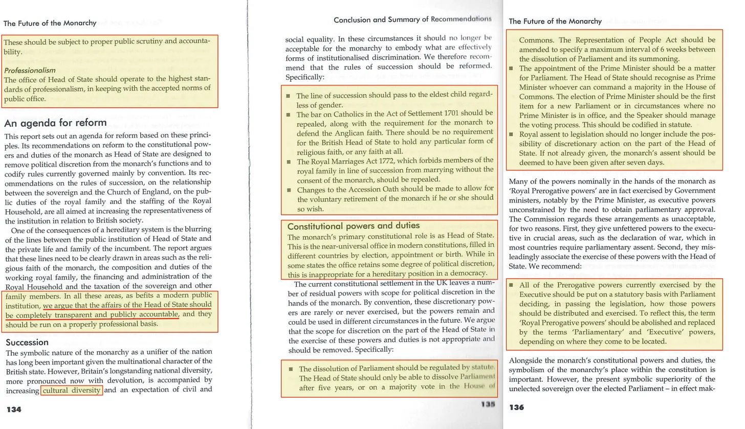 Συνιστά επίσης τη μεταρρύθμιση της διαδοχής, την κατάργηση της απαγόρευσης του καθολικισμού και της απαίτησης για τον μονάρχη να υπερασπίζεται την αγγλικανική πίστη, ή ακόμη και να έχει κάποια συγκεκριμένη θρησκευτική πίστη - αν έχει καθόλου. Τα μέλη της βασιλικής οικογένειας θα πρέπει επίσης να μπορούν να παντρεύονται όποιον επιλέγουν, και αν ένας μονάρχης αποφασίσει οικειοθελώς να αποσυρθεί, αυτό θα θεωρείται πλέον επίσης αποδεκτό. Και η εξουσία διάλυσης του κοινοβουλίου θα πρέπει να ανακληθεί, ο διορισμός του πρωθυπουργού θα πρέπει πλέον να παρακάμπτει τον μονάρχη και η βασιλική συναίνεση στη νομοθεσία θα πρέπει επίσης να μεταρρυθμιστεί.