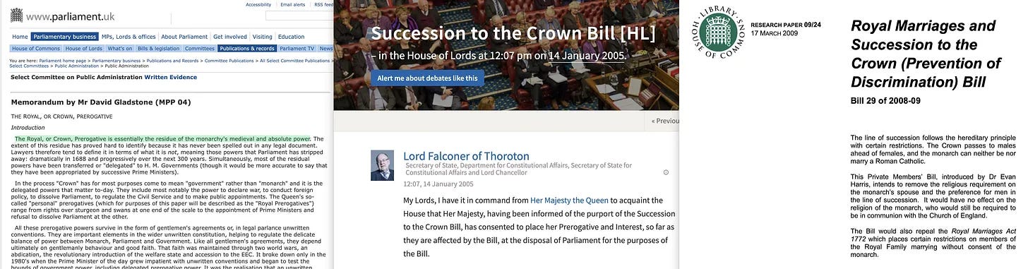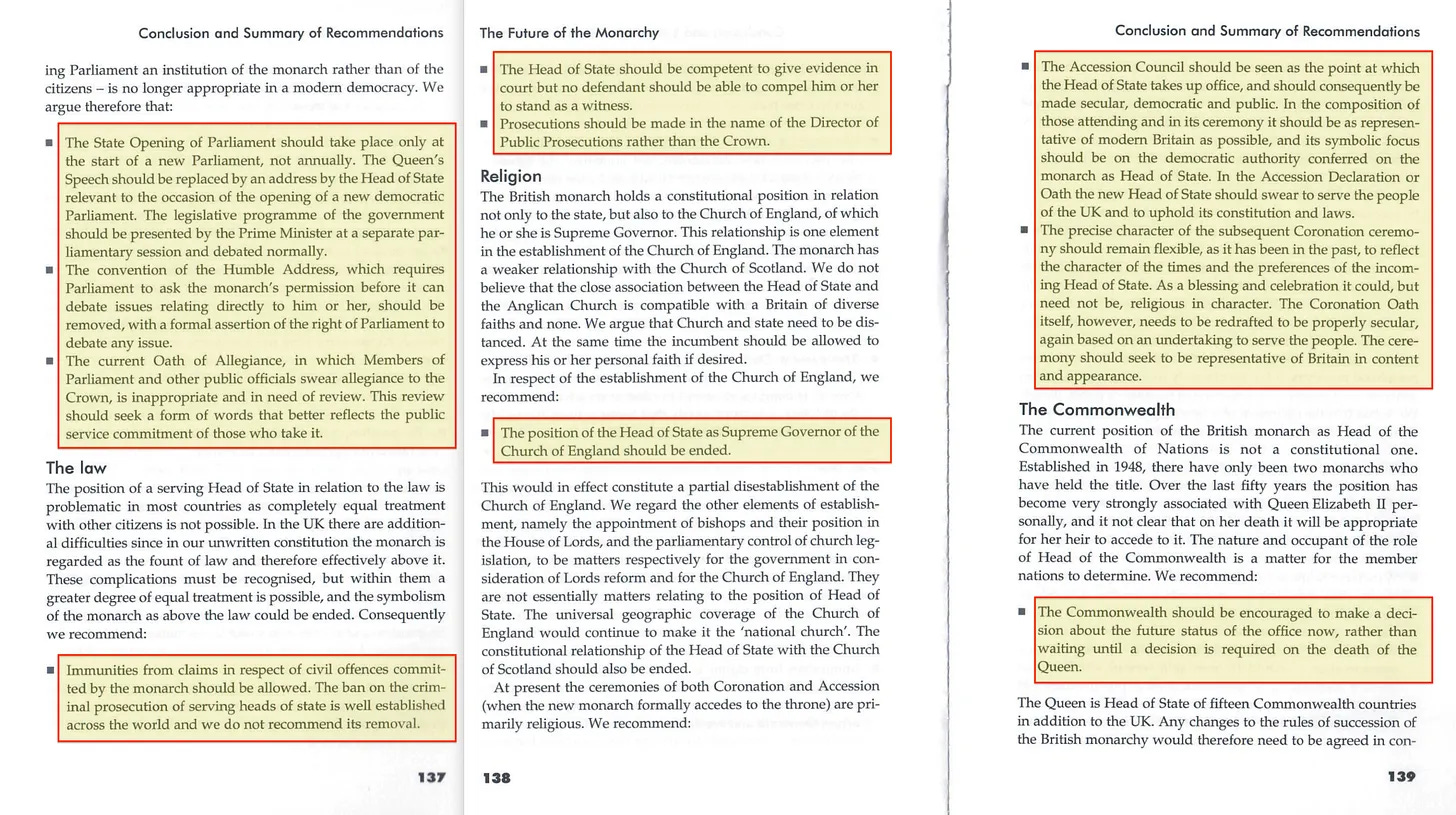 Το επίσημο άνοιγμα της Βουλής θα πρέπει να γίνεται μόνο κατά την έναρξη της νέας Βουλής και όχι κάθε χρόνο, ενώ η ομιλία της Βασίλισσας θα πρέπει να αντικατασταθεί από ομιλία του Πρωθυπουργού. Επιπλέον, η θέση του αρχηγού του κράτους ως ανώτατου κυβερνήτη της Εκκλησίας της Αγγλίας θα πρέπει να τερματιστεί. Υπάρχουν πολλές ακόμη προτάσεις σε αυτές τις σελίδες, τις οποίες σας συνιστώ να εξερευνήσετε μόνοι σας.
