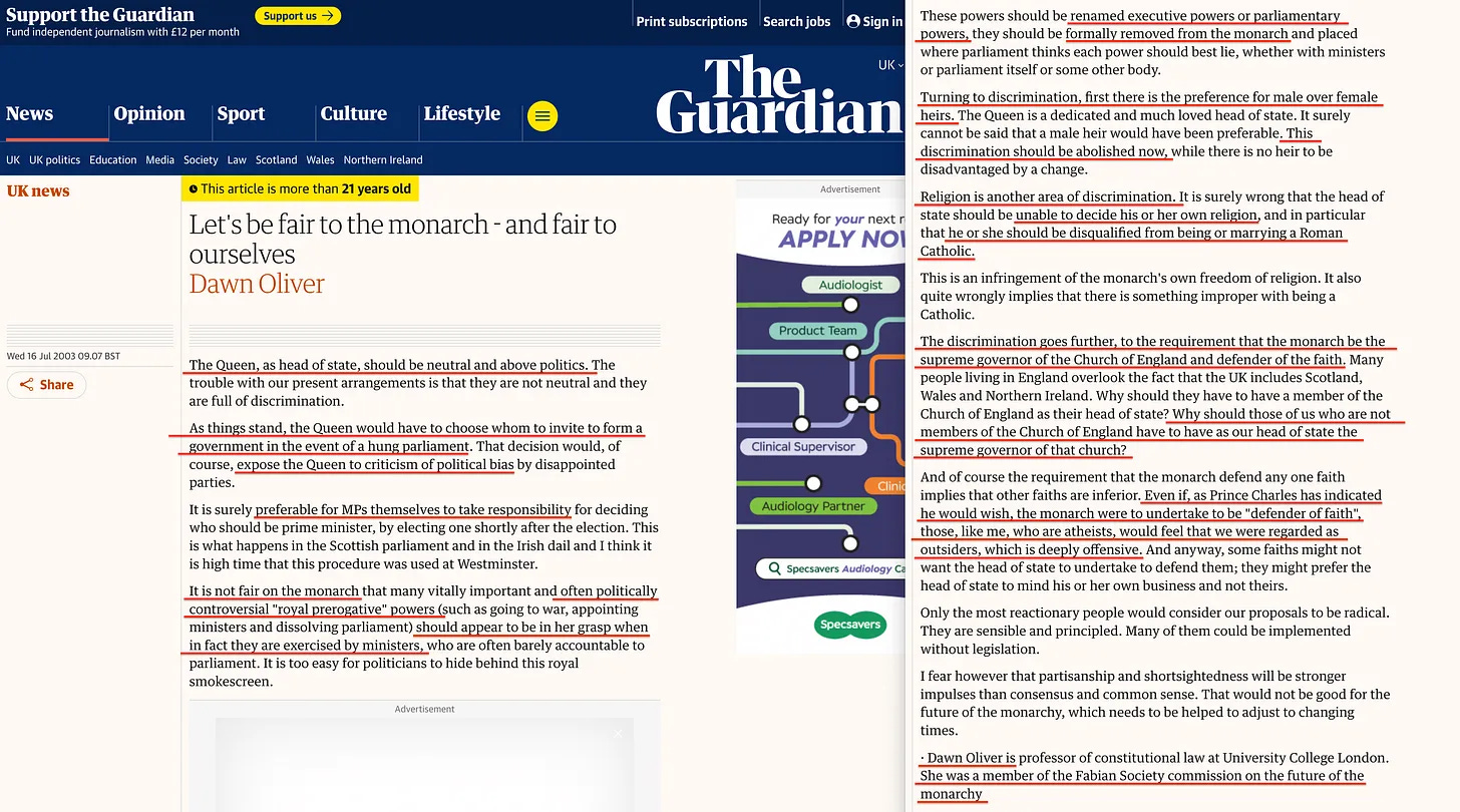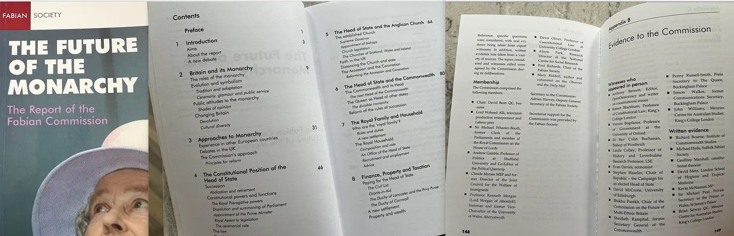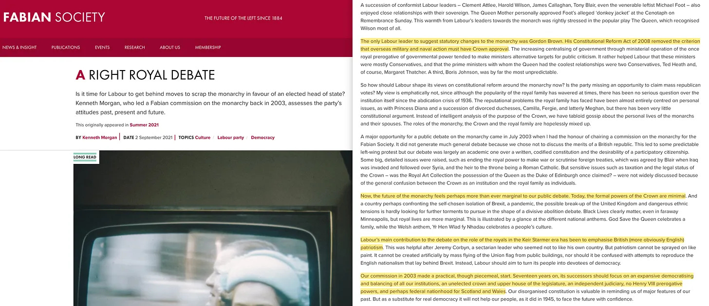 Στην πραγματικότητα, μέχρι το 2021, η Fabian Society επέστρεψε, απαιτώντας άλλη μια θυσία. Ο Kenneth Morgan, ο οποίος ηγήθηκε μιας επιτροπής της Fabian για τη μοναρχία το 2003, αναρωτήθηκε αν ήταν καιρός οι Εργατικοί να στηρίξουν τις κινήσεις για την κατάργηση της μοναρχίας υπέρ ενός εκλεγμένου αρχηγού κράτους. Δεν είναι ζήτημα του αν, αλλά του πότε. Κατά σύμπτωση, ο Morgan καταλήγει σε αυτό το σημείωμα -